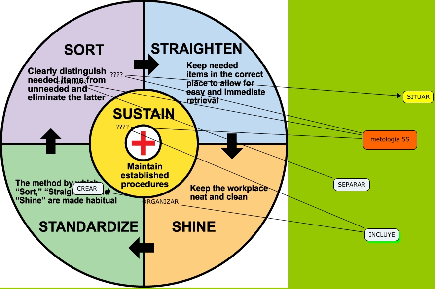 Este Cmap, tiene información relacionada con: Practica 5S, metologia 5S ???? SITUAR, metologia 5S ???? INCLUYE, INCLUYE ORGANIZAR CREAR, metologia 5S ELIMINAR SEPARAR