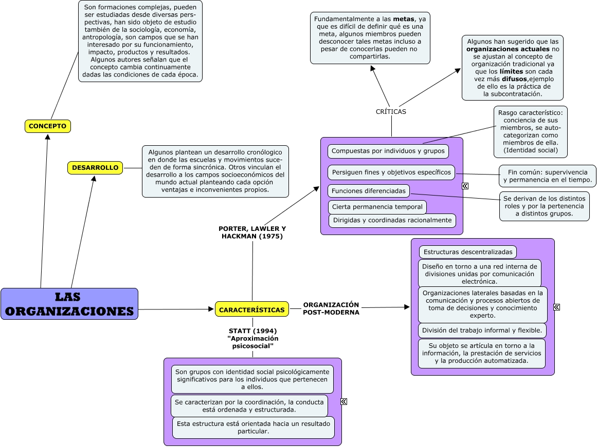 Este Cmap, tiene información relacionada con: MAPA_RESUMEN_PSICOLOGIA_ORGANIZACIONES_1.1, LAS ORGANIZACIONES ???? CARACTERÍSTICAS, ???? CRÍTICAS Fundamentalmente a las metas, ya que es difícil de definir qué es una meta, algunos miembros pueden desconocer tales metas incluso a pesar de conocerlas pueden no compartirlas., LAS ORGANIZACIONES ???? DESARROLLO, Persiguen fines y objetivos específicos ???? Fin común: supervivencia y permanencia en el tiempo., DESARROLLO ???? Algunos plantean un desarrollo cronólogico en donde las escuelas y movimientos suce- den de forma sincrónica. Otros vinculan el desarrollo a los campos socioeconómicos del mundo actual planteando cada opción ventajas e inconvenientes propios., CARACTERÍSTICAS STATT (1994) "Aproximación psicosocial" ????, LAS ORGANIZACIONES ???? CONCEPTO, ???? CRÍTICAS Algunos han sugerido que las organizaciones actuales no se ajustan al concepto de organización tradicional ya que los límites son cada vez más difusos,ejemplo de ello es la práctica de la subcontratación., Compuestas por individuos y grupos ???? Rasgo característico: conciencia de sus miembros, se auto- categorizan como miembros de ella. (Identidad social), Funciones diferenciadas ???? Se derivan de los distintos roles y por la pertenencia a distintos grupos., CARACTERÍSTICAS PORTER, LAWLER Y HACKMAN (1975) ????, CARACTERÍSTICAS ORGANIZACIÓN POST-MODERNA ????, CONCEPTO ???? Son formaciones complejas, pueden ser estudiadas desde diversas pers- pectivas, han sido objeto de estudio también de la sociología, economía, antropología, son campos que se han interesado por su funcionamiento, impacto, productos y resultados. Algunos autores señalan que el concepto cambia continuamente dadas las condiciones de cada época.