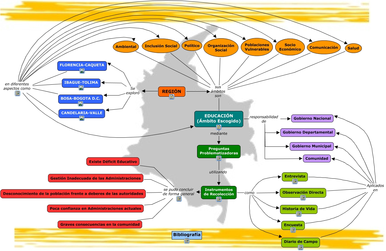 Este Cmap, tiene información relacionada con: Mapa de Conocimiento Regional, EDUCACIÓN (Ámbito Escogido) responsabilidad de Comunidad, IBAGUE-TOLIMA en diferentes aspectos como Político, FLORENCIA-CAQUETA en diferentes aspectos como EDUCACIÓN (Ámbito Escogido), REGIÓN sus ámbitos son Ambiental, FLORENCIA-CAQUETA en diferentes aspectos como Salud, Encuesta Aplicados en Gobierno Departamental, FLORENCIA-CAQUETA en diferentes aspectos como Ambiental, BOSA-BOGOTA D.C. en diferentes aspectos como Inclusión Social, REGIÓN Se exploró FLORENCIA-CAQUETA, IBAGUE-TOLIMA en diferentes aspectos como Ambiental, Diario de Campo Aplicados en Gobierno Departamental, REGIÓN Se exploró CANDELARIA-VALLE, Instrumentos de Recolección se pudo concluir de forma general Graves consecuencias en la comunidad, Instrumentos de Recolección se pudo concluir de forma general Poca confianza en Administraciones actuales, Instrumentos de Recolección se pudo concluir de forma general Existe Déficit Educativo, Encuesta Aplicados en Gobierno Nacional, Instrumentos de Recolección como Entrevista, Diario de Campo Aplicados en Comunidad, Organización Social sus ámbitos son Ambiental, Encuesta Aplicados en Comunidad