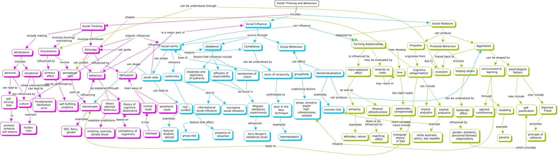This Concept Map, created with IHMC CmapTools, has information related to: Social Thinking and Behaviour, conformity factors that affect group size, obedience factors that influence include closeness and legitimacy of authority, gender, similarity, perceived fairness/ responsibility which provides self justification, mere exposure effect as well as Physical attractiveness, Cognitive categorisation leads to stereotypes, Social Relations can produce Prejudice, primacy effect can be confirmed by self-fulfilling prophecy, Attitudes influenced by Persuasion, stereotypes examples SES, Race, gender, Social Thinking include making attributions, Cognitive categorisation shapes perceptual sets, closeness and legitimacy of authority as found in Milgram obedience experiments, theory of cognitive dissonance based on consistency of cognitions, mere exposure effect as well as similarity, bystander effect influenced by gender, similarity, perceived fairness/ responsibility, environment & learning through modeling, rewards vs costs may result in love, social roles influence behaviour, self-fulfilling prophecy influencing behaviour, obedience factors that influence include diffusion of responsibility