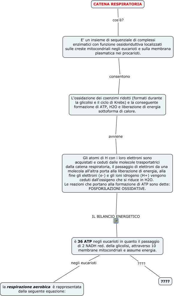 Questa Cmap, creata con IHMC CmapTools, contiene informazioni relative a: Senza titolo 9.cmap, L'ossidazione dei coenzimi ridotti (formati durante la glicolisi e il ciclo di Krebs) e la conseguente formazione di ATP, H2O e liberazione di energia sottoforma di calore. avviene Gli atomi di H con i loro elettroni sono acquistati e ceduti dalle molecole trasportatrici dalla catena respiratoria, il passaggio di elettroni da una molecola all'altra porta alla liberazione di energia, alla fine gli elettroni (e-) e gli ioni idrogeno (H+) vengono ceduti dall'ossigeno che si riduce in H2O. Le reazioni che portano alla formazione di ATP sono dette: FOSFORILAZIONI OSSIDATIVE., è 36 ATP negli eucarioti in quanto il passaggio di 2 NADH red. della glicolisi, attraverso 10 membrane mitocondriali e assume energia. negli eucarioti la respirazione aerobica è rappresentata dalla seguente equazione:, E' un insieme di sequenziale di complessi enzimatici con funzione ossidoriduttiva localizzati sulle creste mitocondriali negli eucarioti e sulla membrana plasmatica nei procarioti. consentono L'ossidazione dei coenzimi ridotti (formati durante la glicolisi e il ciclo di Krebs) e la conseguente formazione di ATP, H2O e liberazione di energia sottoforma di calore., è 36 ATP negli eucarioti in quanto il passaggio di 2 NADH red. della glicolisi, attraverso 10 membrane mitocondriali e assume energia. ???? ????, CATENA RESPIRATORIA cos'è? E' un insieme di sequenziale di complessi enzimatici con funzione ossidoriduttiva localizzati sulle creste mitocondriali negli eucarioti e sulla membrana plasmatica nei procarioti., Gli atomi di H con i loro elettroni sono acquistati e ceduti dalle molecole trasportatrici dalla catena respiratoria, il passaggio di elettroni da una molecola all'altra porta alla liberazione di energia, alla fine gli elettroni (e-) e gli ioni idrogeno (H+) vengono ceduti dall'ossigeno che si riduce in H2O. Le reazioni che portano alla formazione di ATP sono dette: FOSFORILAZIONI OSSIDATIVE. IL BILANCIO ENERGETICO è 36 ATP negli eucarioti in quanto il passaggio di 2 NADH red. della glicolisi, attraverso 10 membrane mitocondriali e assume energia.