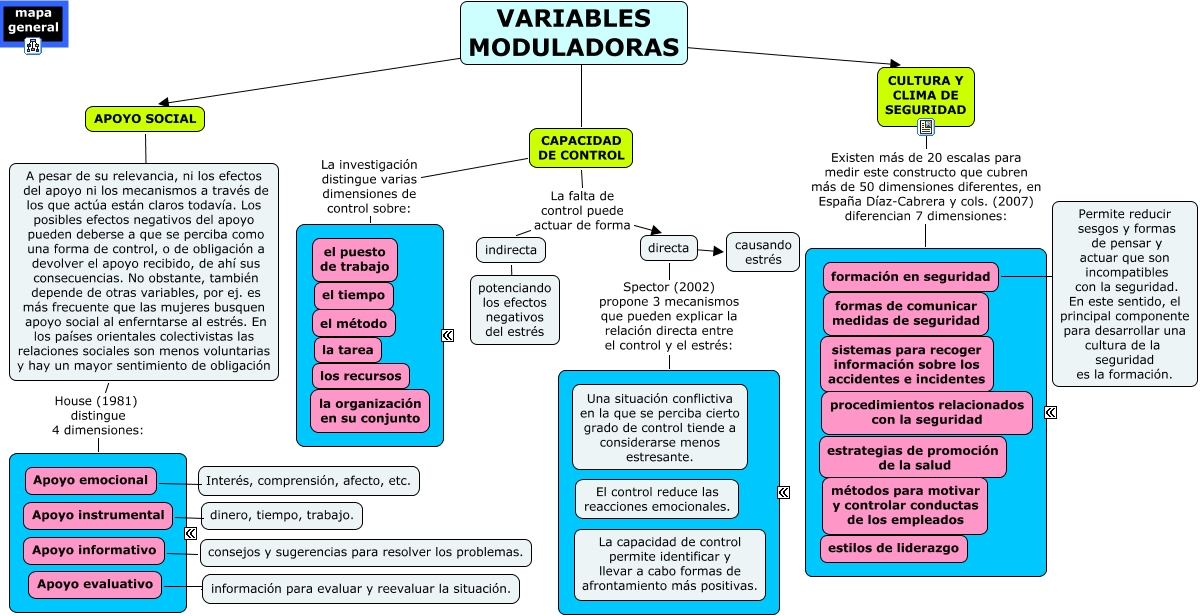 Este Cmap, tiene información relacionada con: MAPA_RESUMEN_PSICOLOGIA_ORGANIZACIONES_8.4, CAPACIDAD DE CONTROL La investigación distingue varias dimensiones de control sobre: ????, VARIABLES MODULADORAS ???? APOYO SOCIAL, Apoyo instrumental ???? dinero, tiempo, trabajo., VARIABLES MODULADORAS ???? CULTURA Y CLIMA DE SEGURIDAD, CAPACIDAD DE CONTROL La falta de control puede actuar de forma indirecta, A pesar de su relevancia, ni los efectos del apoyo ni los mecanismos a través de los que actúa están claros todavía. Los posibles efectos negativos del apoyo pueden deberse a que se perciba como una forma de control, o de obligación a devolver el apoyo recibido, de ahí sus consecuencias. No obstante, también depende de otras variables, por ej. es más frecuente que las mujeres busquen apoyo social al enferntarse al estrés. En los países orientales colectivistas las relaciones sociales son menos voluntarias y hay un mayor sentimiento de obligación House (1981) distingue 4 dimensiones: ????, indirecta ???? potenciando los efectos negativos del estrés, VARIABLES MODULADORAS ???? CAPACIDAD DE CONTROL, directa ???? causando estrés, CULTURA Y CLIMA DE SEGURIDAD Existen más de 20 escalas para medir este constructo que cubren más de 50 dimensiones diferentes, en España Díaz-Cabrera y cols. (2007) diferencian 7 dimensiones: ????, formación en seguridad ???? Permite reducir sesgos y formas de pensar y actuar que son incompatibles con la seguridad. En este sentido, el principal componente para desarrollar una cultura de la seguridad es la formación., Apoyo emocional ???? Interés, comprensión, afecto, etc., Apoyo informativo ???? consejos y sugerencias para resolver los problemas., CAPACIDAD DE CONTROL La falta de control puede actuar de forma directa, directa Spector (2002) propone 3 mecanismos que pueden explicar la relación directa entre el control y el estrés: ????, Apoyo evaluativo ???? información para evaluar y reevaluar la situación., APOYO SOCIAL ???? A pesar de su relevancia, ni los efectos del apoyo ni los mecanismos a través de los que actúa están claros todavía. Los posibles efectos negativos del apoyo pueden deberse a que se perciba como una forma de control, o de obligación a devolver el apoyo recibido, de ahí sus consecuencias. No obstante, también depende de otras variables, por ej. es más frecuente que las mujeres busquen apoyo social al enferntarse al estrés. En los países orientales colectivistas las relaciones sociales son menos voluntarias y hay un mayor sentimiento de obligación