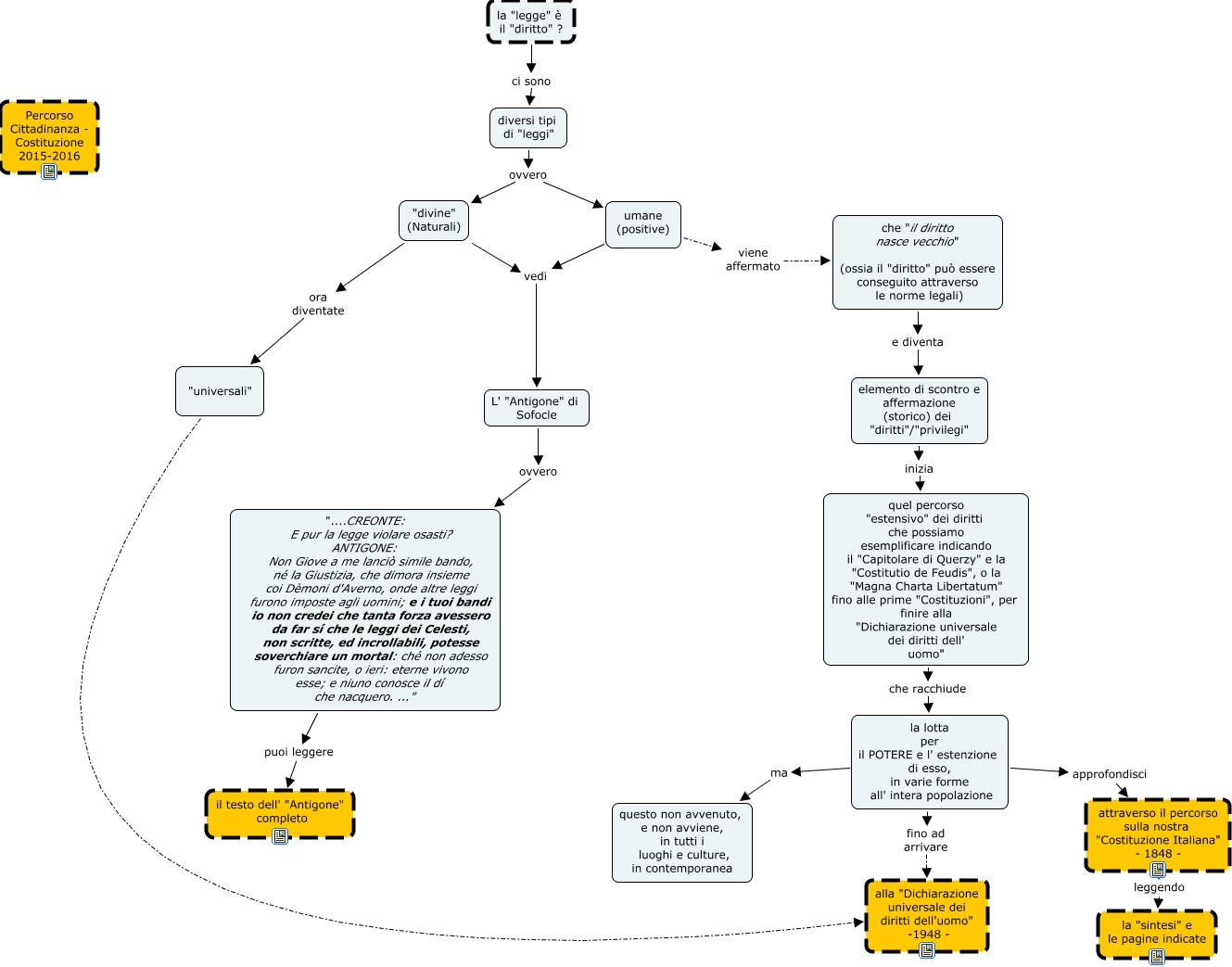 Questa Cmap, creata con IHMC CmapTools, contiene informazioni relative a: Cittadinanza e le sue origini, "divine" (Naturali) ora diventate "universali", L' "Antigone" di Sofocle ovvero "....CREONTE: E pur la legge violare osasti? ANTIGONE: Non Giove a me lanciò simile bando, né la Giustizia, che dimora insieme coi Dèmoni d'Averno, onde altre leggi furono imposte agli uomini; e i tuoi bandi io non credei che tanta forza avessero da far sí che le leggi dei Celesti, non scritte, ed incrollabili, potesse soverchiare un mortal: ché non adesso furon sancite, o ieri: eterne vivono esse; e niuno conosce il dí che nacquero. ...", umane (positive) vedi L' "Antigone" di Sofocle, "universali" alla "Dichiarazione universale dei diritti dell'uomo" -1948 -, diversi tipi di "leggi" ovvero "divine" (Naturali), diversi tipi di "leggi" ovvero umane (positive), umane (positive) viene affermato che "il diritto nasce vecchio" (ossia il "diritto" può essere conseguito attraverso le norme legali), la lotta per il POTERE e l' estenzione di esso, in varie forme all' intera popolazione fino ad arrivare alla "Dichiarazione universale dei diritti dell'uomo" -1948 -, "divine" (Naturali) vedi L' "Antigone" di Sofocle, la "legge" è il "diritto" ? ci sono diversi tipi di "leggi", quel percorso "estensivo" dei diritti che possiamo esemplificare indicando il "Capitolare di Querzy" e la "Costitutio de Feudis", o la "Magna Charta Libertatum" fino alle prime "Costituzioni", per finire alla "Dichiarazione universale dei diritti dell' uomo" che racchiude la lotta per il POTERE e l' estenzione di esso, in varie forme all' intera popolazione, elemento di scontro e affermazione (storico) dei "diritti"/"privilegi" inizia quel percorso "estensivo" dei diritti che possiamo esemplificare indicando il "Capitolare di Querzy" e la "Costitutio de Feudis", o la "Magna Charta Libertatum" fino alle prime "Costituzioni", per finire alla "Dichiarazione universale dei diritti dell' uomo", "....CREONTE: E pur la legge violare osasti? ANTIGONE: Non Giove a me lanciò simile bando, né la Giustizia, che dimora insieme coi Dèmoni d'Averno, onde altre leggi furono imposte agli uomini; e i tuoi bandi io non credei che tanta forza avessero da far sí che le leggi dei Celesti, non scritte, ed incrollabili, potesse soverchiare un mortal: ché non adesso furon sancite, o ieri: eterne vivono esse; e niuno conosce il dí che nacquero. ..." puoi leggere il testo dell' "Antigone" completo, che "il diritto nasce vecchio" (ossia il "diritto" può essere conseguito attraverso le norme legali) e diventa elemento di scontro e affermazione (storico) dei "diritti"/"privilegi", attraverso il percorso sulla nostra "Costituzione Italiana" - 1848 - leggendo la "sintesi" e le pagine indicate, la lotta per il POTERE e l' estenzione di esso, in varie forme all' intera popolazione approfondisci attraverso il percorso sulla nostra "Costituzione Italiana" - 1848 -, la lotta per il POTERE e l' estenzione di esso, in varie forme all' intera popolazione ma questo non avvenuto, e non avviene, in tutti i luoghi e culture, in contemporanea