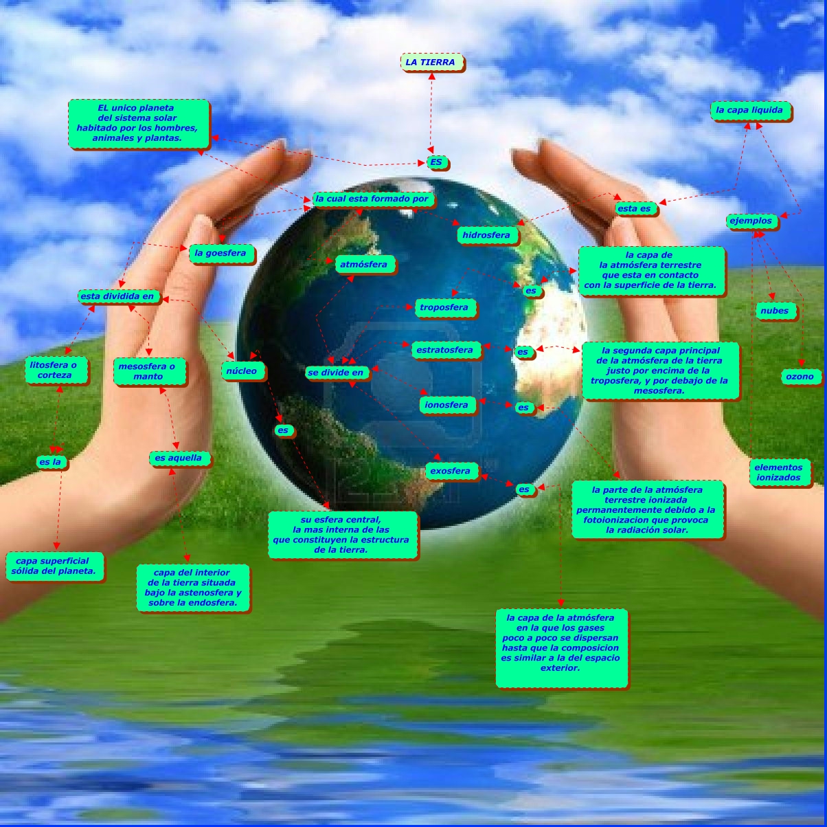 Este Cmap, tiene información relacionada con: LA TIERRA, núcleo es su esfera central, la mas interna de las que constituyen la estructura de la tierra., litosfera o corteza es la capa superficial sólida del planeta., EL unico planeta del sistema solar habitado por los hombres, animales y plantas. la cual esta formado por atmósfera, la capa liquida ejemplos ozono, atmósfera se divide en exosfera, ionosfera es la parte de la atmósfera terrestre ionizada permanentemente debido a la fotoionizacion que provoca la radiación solar., atmósfera se divide en ionosfera, la capa liquida ejemplos elementos ionizados, troposfera es la capa de la atmósfera terrestre que esta en contacto con la superficie de la tierra., EL unico planeta del sistema solar habitado por los hombres, animales y plantas. la cual esta formado por la goesfera, la goesfera esta dividida en mesosfera o manto, atmósfera se divide en estratosfera, mesosfera o manto es aquella capa del interior de la tierra situada bajo la astenosfera y sobre la endosfera., EL unico planeta del sistema solar habitado por los hombres, animales y plantas. la cual esta formado por hidrosfera, estratosfera es la segunda capa principal de la atmósfera de la tierra justo por encima de la troposfera, y por debajo de la mesosfera., LA TIERRA ES EL unico planeta del sistema solar habitado por los hombres, animales y plantas., la goesfera esta dividida en núcleo, hidrosfera esta es la capa liquida, exosfera es la capa de la atmósfera en la que los gases poco a poco se dispersan hasta que la composicion es similar a la del espacio exterior., atmósfera se divide en troposfera