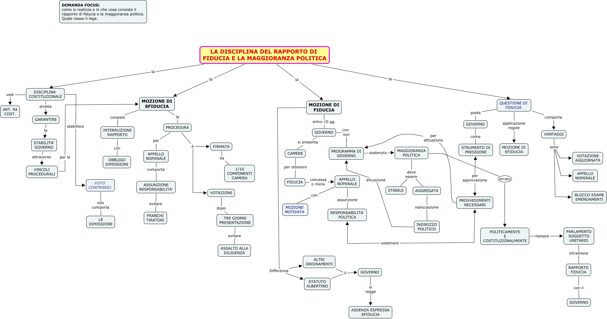 Questa Cmap, creata con IHMC CmapTools, contiene informazioni relative a: Pag 162-164 LA DISCIPLINA DEL RAPPORTO DI FIDUCIA E LA MAGGIORANZA POLITICA, STATUTO ALBERTINO il GOVERNO, INDIRIZZO POLITICO attuazione PROGRAMMA DI GOVERNO, APPELLO NOMINALE comporta ASSUNZIONE RESPONSABILITA', DISCIPLINA COSTITUZIONALE stabilisce VOTO CONTRARIO, GOVERNO si regge ASSENZA ESPRESSA SFIDUCIA, GARANTIRE la STABILITA' GOVERNO, DISCIPLINA COSTITUZIONALE vedi ART. 94 COST., VOTO CONTRARIO non comporta LE DIMISSIONE, LA DISCIPLINA DEL RAPPORTO DI FIDUCIA E LA MAGGIORANZA POLITICA la QUESTIONE DI FIDUCIA, QUESTIONE DI FIDUCIA posta GOVERNO, FIDUCIA concessa o meno APPELLO NOMINALE, PROVVEDIMENTI NECESSARI per attuazione PROGRAMMA DI GOVERNO, TRE GIORNI PRESENTAZIONE evitare ASSALTO ALLA DILIGENZA, PARLAMENTO SOGGETTO UNITARIO intrattiene RAPPORTO FIDUCIA, VANTAGGI sono APPELLO NOMINALE, MAGGIORANZA POLITICA deve essere AGGREGATA, LA DISCIPLINA DEL RAPPORTO DI FIDUCIA E LA MAGGIORANZA POLITICA la MOZIONE DI SFIDUCIA, FIRMATA da 1/10 COMPONENTI CAMERA, PROGRAMMA DI GOVERNO sostenuto MAGGIORANZA POLITICA, MOZIONE DI FIDUCIA Differenza STATUTO ALBERTINO