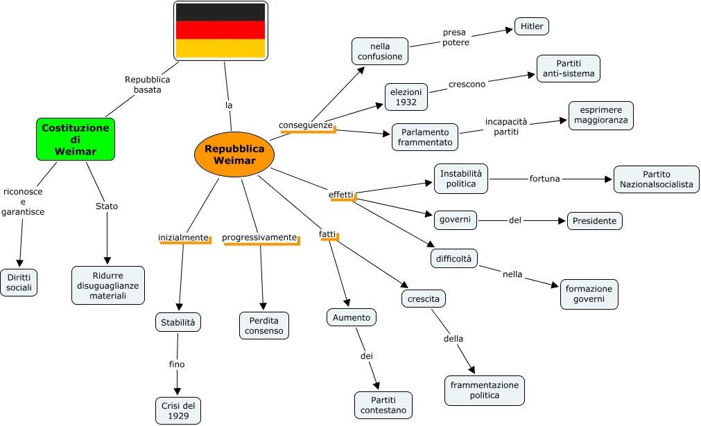 Questa Cmap, creata con IHMC CmapTools, contiene informazioni relative a: Pag 47 IN GERMANIA, Repubblica Weimar progressivamente Perdita consenso, Instabilità politica fortuna Partito Nazionalsocialista, Aumento dei Partiti contestano, governi del Presidente, Repubblica basata Costituzione di Weimar, Repubblica Weimar fatti crescita, Repubblica Weimar effetti difficoltà, Repubblica Weimar effetti Instabilità politica, la Repubblica Weimar, Parlamento frammentato incapacità partiti esprimere maggioranza, nella confusione presa potere Hitler, Costituzione di Weimar Stato Ridurre disuguaglianze materiali, difficoltà nella formazione governi, Repubblica Weimar inizialmente Stabilità, Stabilità fino Crisi del 1929, Repubblica Weimar fatti Aumento, Repubblica Weimar conseguenze elezioni 1932, crescita della frammentazione politica, elezioni 1932 crescono Partiti anti-sistema, Costituzione di Weimar riconosce e garantisce Diritti sociali