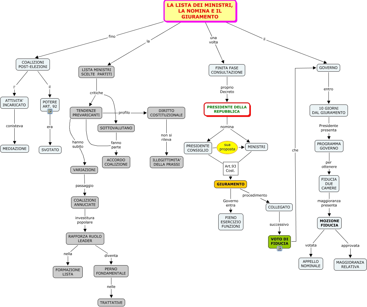 Questa Cmap, creata con IHMC CmapTools, contiene informazioni relative a: Pag 181-183 LA LISTA DEI MINISTRI, LA NOMINA E IL GIURAMENTO, PERNO FONDAMENTALE nelle TRATTATIVE, PRESIDENTE CONSIGLIO Art.93 Cost. GIURAMENTO, VOTO DI FIDUCIA che GOVERNO, SOTTOVALUTANO fanno parte ACCORDO COALIZIONE, GIURAMENTO Governo entra PIENO ESERCIZIO FUNZIONI, PRESIDENTE DELLA REPUBBLICA nomina PRESIDENTE CONSIGLIO, COLLEGATO successivo VOTO DI FIDUCIA, LA LISTA DEI MINISTRI, LA NOMINA E IL GIURAMENTO fino COALIZIONI POST-ELEZIONI, POTERE ART. 92 era SVOTATO, LISTA MINISTRI SCELTE PARTITI critiche TENDENZE PREVARICANTI, LISTA MINISTRI SCELTE PARTITI critiche SOTTOVALUTANO, MOZIONE FIDUCIA votata APPELLO NOMINALE, MINISTRI Art.93 Cost. GIURAMENTO, COALIZIONI POST-ELEZIONI il POTERE ART. 92, VARIAZIONI passaggio COALIZIONI ANNUCIATE, TENDENZE PREVARICANTI profilo DIRITTO COSTITUZIONALE, TENDENZE PREVARICANTI fanno parte ACCORDO COALIZIONE, RAFFORZA RUOLO LEADER nella FORMAZIONE LISTA, LA LISTA DEI MINISTRI, LA NOMINA E IL GIURAMENTO il GOVERNO, LA LISTA DEI MINISTRI, LA NOMINA E IL GIURAMENTO una volta FINITA FASE CONSULTAZIONE