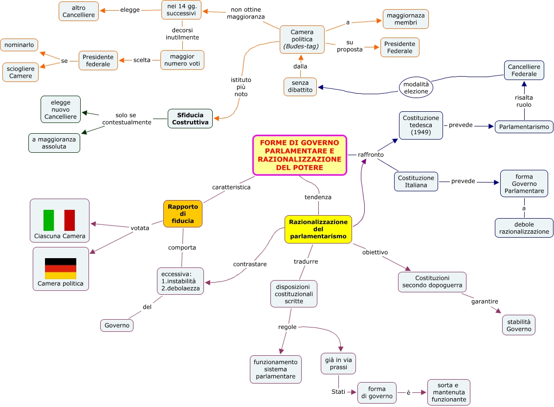 Questa Cmap, creata con IHMC CmapTools, contiene informazioni relative a: Pag 132-134 FORME DI GOVERNO PARLAMENTARE E RAZIONALIZZAZIONE DEL POTERE, FORME DI GOVERNO PARLAMENTARE E RAZIONALIZZAZIONE DEL POTERE raffronto Costituzione Italiana, nei 14 gg. successivi decorsi inutilmente maggior numero voti, Presidente federale se sciogliere Camere, disposizioni costituzionali scritte regole già in via prassi, disposizioni costituzionali scritte regole funzionamento sistema parlamentare, forma di governo è sorta e mantenuta funzionante, Cancelliere Federale modalità elezione senza dibattito, Razionalizzazione del parlamentarismo obiettivo Costituzioni secondo dopoguerra, FORME DI GOVERNO PARLAMENTARE E RAZIONALIZZAZIONE DEL POTERE tendenza Razionalizzazione del parlamentarismo, Sfiducia Costruttiva solo se contestualmente a maggioranza assoluta, Parlamentarismo risalta ruolo Cancelliere Federale, Razionalizzazione del parlamentarismo raffronto Costituzione Italiana, Costituzione Italiana prevede forma Governo Parlamentare, Razionalizzazione del parlamentarismo raffronto Costituzione tedesca (1949), Presidente federale se nominarlo, nei 14 gg. successivi elegge altro Cancelliere, senza dibattito dalla Camera politica (Budes-tag), Sfiducia Costruttiva solo se contestualmente elegge nuovo Cancelliere, Camera politica (Budes-tag) istituto più noto Sfiducia Costruttiva, forma Governo Parlamentare a debole razionalizzazione