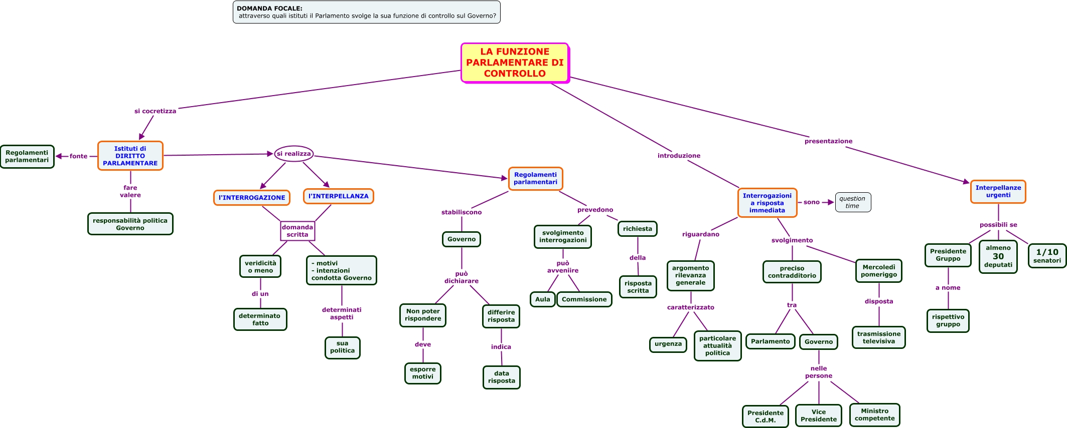 Questa Cmap, creata con IHMC CmapTools, contiene informazioni relative a: Pag 223-225 LA FUNZIONE PARLAMENTARE DI CONTROLLO, Interpellanze urgenti possibili se almeno 30 deputati, Presidente Gruppo a nome rispettivo gruppo, veridicità o meno di un determinato fatto, Governo nelle persone Vice Presidente, Istituti di DIRITTO PARLAMENTARE si realizza l'INTERROGAZIONE, preciso contradditorio tra Governo, - motivi - intenzioni condotta Governo determinati aspetti sua politica, Governo nelle persone Presidente C.d.M., Governo può dichiarare differire risposta, LA FUNZIONE PARLAMENTARE DI CONTROLLO si cocretizza Istituti di DIRITTO PARLAMENTARE, Mercoledì pomeriggo disposta trasmissione televisiva, Istituti di DIRITTO PARLAMENTARE fare valere responsabilità politica Governo, Interpellanze urgenti possibili se Presidente Gruppo, svolgimento interrogazioni può avveniire Aula, Interrogazioni a risposta immediata svolgimento preciso contradditorio, LA FUNZIONE PARLAMENTARE DI CONTROLLO introduzione Interrogazioni a risposta immediata, Non poter rispondere deve esporre motivi, Interpellanze urgenti possibili se 1/10 senatori, l'INTERPELLANZA domanda scritta veridicità o meno, Regolamenti parlamentari stabiliscono Governo