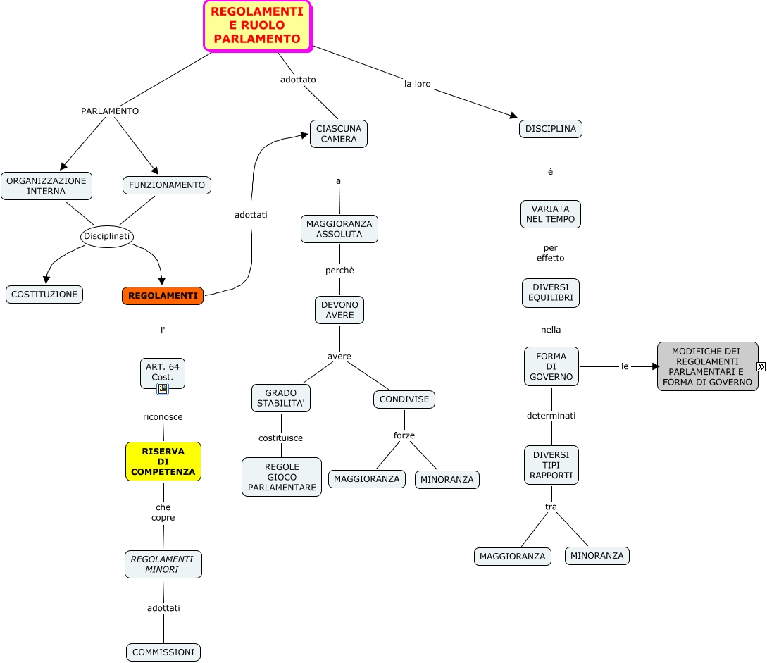 Questa Cmap, creata con IHMC CmapTools, contiene informazioni relative a: Pag 208 REGOLAMENTI E RUOLO PARLAMENTO, FORMA DI GOVERNO determinati DIVERSI TIPI RAPPORTI, VOTO PALESE arginare fenomeno FRANCHI TIRATORI, MODIFICHE DEI REGOLAMENTI i REGOLAMENTI DEL 1971, DIVERSI TIPI RAPPORTI tra MINORANZA, GRADO STABILITA' costituisce REGOLE GIOCO PARLAMENTARE, RUOLO FUNZIONALE tra MINORANZA, PRESIDENTI GRUPPI nella PROGRAMMAZIONE LAVORI, SVOLTA MAGGIORITARIA DEL 1993 valorizzato RUOLO GOVERNO, REGOLAMENTI l' ART. 64 Cost., DEVONO AVERE avere CONDIVISE, NOVELLE dal 1981 al 1986 determinano PROGERSSIVO ALLONTANAMENTO, RUOLO GOVERNO programmazione LAVORI PARLAMENTARI, ORGANIZZAZIONE INTERNA Disciplinati COSTITUZIONE, PROCESSO MODIFICA iniziato NOVELLE dal 1981 al 1986, PROGERSSIVO ALLONTANAMENTO dal PRINCIPIO PARITA', REGOLAMENTI MINORI adottati COMMISSIONI, DIVERSI TIPI RAPPORTI tra MAGGIORANZA, REGOLAMENTI E RUOLO PARLAMENTO PARLAMENTO FUNZIONAMENTO, PROCESSO MODIFICA SVOLTA MODIFICA del 1988, CONDIVISE forze MAGGIORANZA