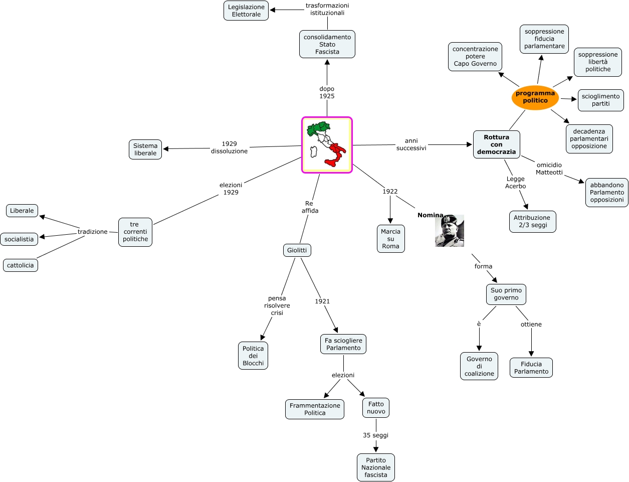 Questa Cmap, creata con IHMC CmapTools, contiene informazioni relative a: Pag 48 ITALIA, Rottura con democrazia omicidio Matteotti abbandono Parlamento opposizioni, Nomina forma Suo primo governo, anni successivi Rottura con democrazia, Suo primo governo ottiene Fiducia Parlamento, Rottura con democrazia programma politico soppressione libertà politiche, Re affida Giolitti, Rottura con democrazia programma politico soppressione fiducia parlamentare, tre correnti politiche tradizione cattolicia, 1922 Nomina, Suo primo governo è Governo di coalizione, Rottura con democrazia programma politico scioglimento partiti, elezioni 1929 tre correnti politiche, Giolitti 1921 Fa sciogliere Parlamento, Fatto nuovo 35 seggi Partito Nazionale fascista, Giolitti pensa risolvere crisi Politica dei Blocchi, dopo 1925 consolidamento Stato Fascista, Rottura con democrazia Legge Acerbo Attribuzione 2/3 seggi, tre correnti politiche tradizione socialistia, Rottura con democrazia programma politico concentrazione potere Capo Governo, 1929 dissoluzione Sistema liberale