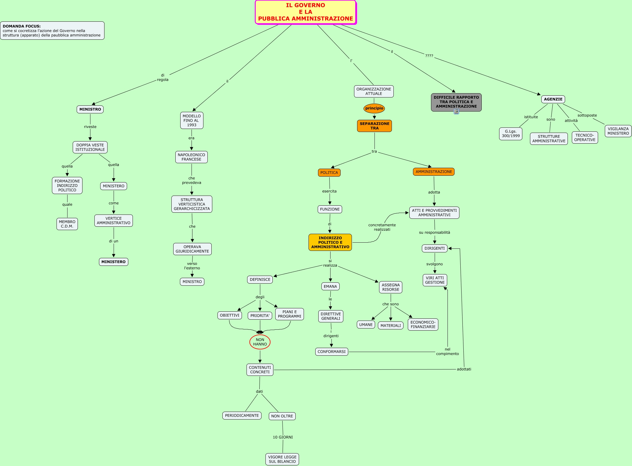 Questa Cmap, creata con IHMC CmapTools, contiene informazioni relative a: Pag 197-200 IL GOVERNO E LA PUBBLICA AMMINISTRAZIONE, EMANA le DIRETTIVE GENERALI, AGENZIE sottoposte VIGILANZA MINISTERO, INDIRIZZO POLITICO E AMMINISTRATIVO si realizza EMANA, VERTICE AMMINISTRATIVO di un MINISTERO, AMMINISTRAZIONE adotta ATTI E PROVVEDIMENTI AMMINISTRATIVI, PIANI E PROGRAMMI NON HANNO CONTENUTI CONCRETI, ORGANIZZAZIONE ATTUALE principio SEPARAZIONE TRA, IL GOVERNO E LA PUBBLICA AMMINISTRAZIONE il MODELLO FINO AL 1993, ASSEGNA RISORSE che sono MATERIALI, IL GOVERNO E LA PUBBLICA AMMINISTRAZIONE ???? AGENZIE, CONTENUTI CONCRETI adottati DIRIGENTI, AGENZIE attività TECNICO- OPERATIVE, FORMAZIONE INDIRIZZO POLITICO quale MEMBRO C.D.M., DIRETTIVE GENERALI i dirigenti CONFORMARSI, DOPPIA VESTE ISTITUZIONALE quella MINISTERO, AGENZIE sono STRUTTURE AMMINISTRATIVE, AGENZIE istituite G.Lgs. 300/1999, IL GOVERNO E LA PUBBLICA AMMINISTRAZIONE l' ORGANIZZAZIONE ATTUALE, CONTENUTI CONCRETI dati NON OLTRE, PRIORITA' NON HANNO CONTENUTI CONCRETI