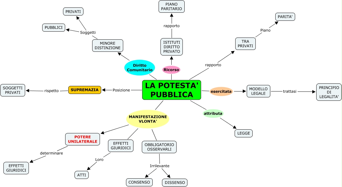 Questa Cmap, creata con IHMC CmapTools, contiene informazioni relative a: Pag29-30 LA POTESTA' PUBBLICA, OBBLIGATORIO OSSERVARLI Irrilevante DISSENSO, LA POTESTA' PUBBLICA MANIFESTAZIONE VLONTA' EFFETTI GIURIDICI, EFFETTI GIURIDICI Loro ATTI, POTERE UNILATERALE determinare EFFETTI GIURIDICI, LA POTESTA' PUBBLICA attributa LEGGE, SUPREMAZIA rispetto SOGGETTI PRIVATI, LA POTESTA' PUBBLICA MANIFESTAZIONE VLONTA' POTERE UNILATERALE, LA POTESTA' PUBBLICA Posizione SUPREMAZIA, MINORE DISTINZIONE Soggetti PUBBLICI, OBBLIGATORIO OSSERVARLI Irrilevante CONSENSO, TRA PRIVATI Piano PARITA', ISTITUTI DIRITTO PRIVATO rapporto PIANO PARITARIO, LA POTESTA' PUBBLICA Ricorso ISTITUTI DIRITTO PRIVATO, LA POTESTA' PUBBLICA esercitata MODELLO LEGALE, LA POTESTA' PUBBLICA Diritto Comunitario MINORE DISTINZIONE, LA POTESTA' PUBBLICA rapporto TRA PRIVATI, MINORE DISTINZIONE Soggetti PRIVATI, MODELLO LEGALE trattasi PRINCIPIO DI LEGALITA', LA POTESTA' PUBBLICA MANIFESTAZIONE VLONTA' OBBLIGATORIO OSSERVARLI