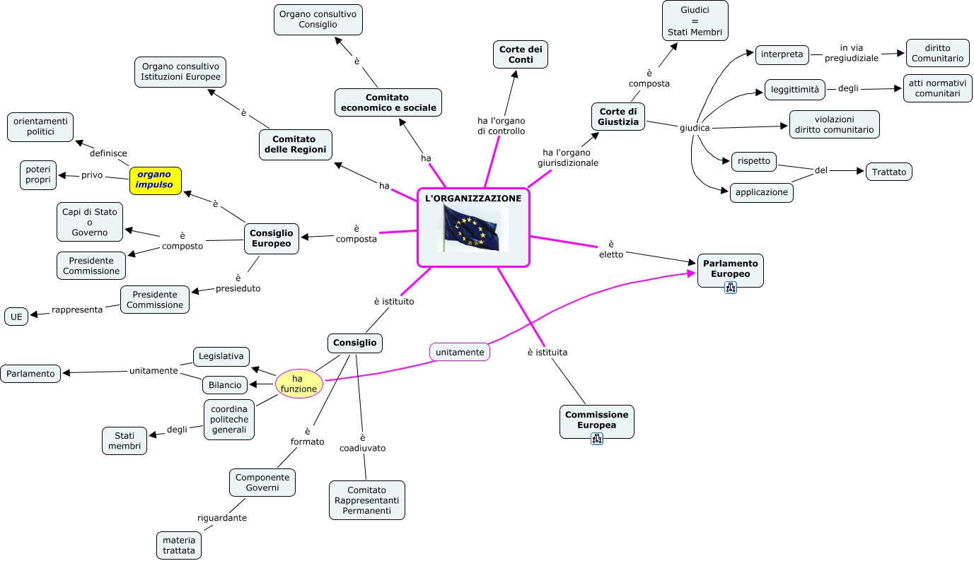 Questa Cmap, creata con IHMC CmapTools, contiene informazioni relative a: Pag 96-100 L'UNIONE EUROPEA - l'Organizzazione, L'ORGANIZZAZIONE è eletto Parlamento Europeo, organo impulso privo poteri propri, Corte di Giustizia giudica interpreta, Consiglio ha funzione Bilancio, L'ORGANIZZAZIONE ha Comitato economico e sociale, Consiglio Europeo è composto Capi di Stato o Governo, Consiglio Europeo è presieduto Presidente Commissione, Corte di Giustizia è composta Giudici = Stati Membri, Corte di Giustizia giudica applicazione, Comitato economico e sociale è Organo consultivo Consiglio, Componente Governi riguardante materia trattata, Consiglio ha funzione Parlamento Europeo, Bilancio unitamente Parlamento, coordina politeche generali degli Stati membri, Consiglio Europeo è organo impulso, organo impulso definisce orientamenti politici, rispetto del Trattato, L'ORGANIZZAZIONE ha l'organo giurisdizionale Corte di Giustizia, Consiglio Europeo è composto Presidente Commissione, applicazione del Trattato