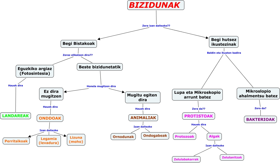 Este Cmap, tiene información relacionada con: BIZIDUNAK DIEGO, Eguzkiko argiaz (Fotosintesia) Hauek dira LANDAREAK, BIZIDUNAK Zera izan daitezke?? Begi hutsez ikustezinak, Begi Bistakoak Zeraz elikatzen dira?? Eguzkiko argiaz (Fotosintesia), ONDDOAK Izan daitezke Legamia (levadura), ANIMALIAK Izan daitezke Ornodunak, Mikroslopio ahalmentsu batez Zera da? BAKTERIOAK, PROTISTOAK Hauek dira Protozoak, Begi hutsez ikustezinak Baldin eta ikusten badira Lupa eta Mikroskopio arrunt batez, ANIMALIAK Izan daitezke Ondogabeak, Beste bizidunetatik Honela mugitzen dira Ez dira mugitzen, Beste bizidunetatik Honela mugitzen dira Mugitu egiten dira, PROTISTOAK Hauek dira Algak, Begi Bistakoak Zeraz elikatzen dira?? Beste bizidunetatik, ONDDOAK Izan daitezke Perritsikoak, Ez dira mugitzen Hauek dira ONDDOAK, ONDDOAK Izan daitezke Lizuna (moho), Mugitu egiten dira Hauek dira ANIMALIAK, Algak Izan daitezke Zelulabakarrak, Lupa eta Mikroskopio arrunt batez Zera da?? PROTISTOAK, Begi hutsez ikustezinak Baldin eta ikusten badira Mikroslopio ahalmentsu batez