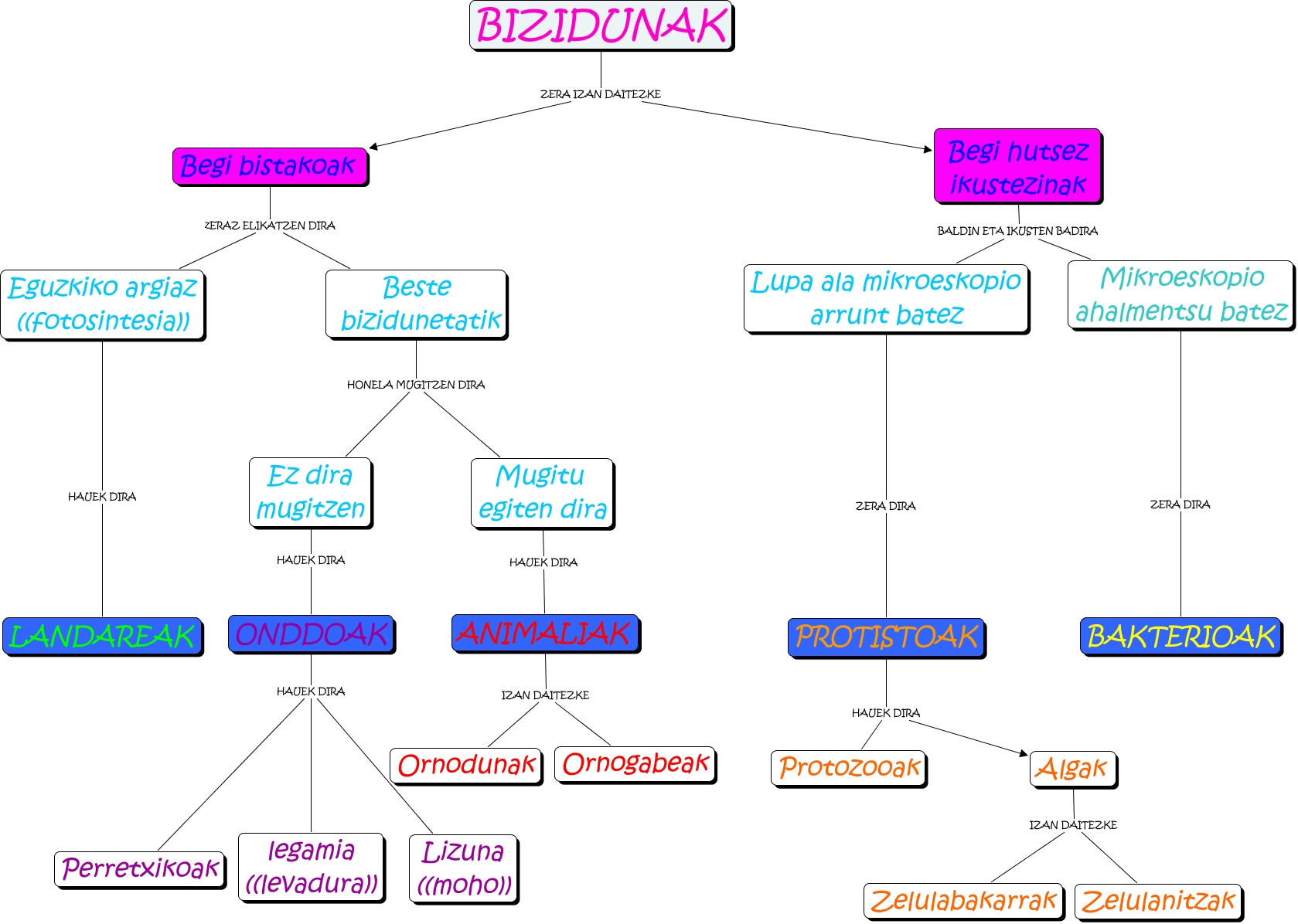 Este Cmap, tiene información relacionada con: BIZIDUNAK PAULA.cmap, Eguzkiko argiaz ((fotosintesia)) HAUEK DIRA LANDAREAK, Algak IZAN DAITEZKE Zelulabakarrak, ONDDOAK HAUEK DIRA legamia ((levadura)), Begi hutsez ikustezinak BALDIN ETA IKUSTEN BADIRA Mikroeskopio ahalmentsu batez, ONDDOAK HAUEK DIRA Perretxikoak, Mugitu egiten dira HAUEK DIRA ANIMALIAK, PROTISTOAK HAUEK DIRA Protozooak, BIZIDUNAK ZERA IZAN DAITEZKE Begi bistakoak, Beste bizidunetatik HONELA MUGITZEN DIRA Ez dira mugitzen, PROTISTOAK HAUEK DIRA Algak, BIZIDUNAK ZERA IZAN DAITEZKE Begi hutsez ikustezinak, Lupa ala mikroeskopio arrunt batez ZERA DIRA PROTISTOAK, Begi bistakoak zERAZ ELIKATZEN DIRA Eguzkiko argiaz ((fotosintesia)), ONDDOAK HAUEK DIRA Lizuna ((moho)), Ez dira mugitzen HAUEK DIRA ONDDOAK, Mikroeskopio ahalmentsu batez ZERA DIRA BAKTERIOAK, Beste bizidunetatik HONELA MUGITZEN DIRA Mugitu egiten dira, Begi bistakoak zERAZ ELIKATZEN DIRA Beste bizidunetatik, ANIMALIAK IZAN DAITEZKE Ornodunak, ANIMALIAK IZAN DAITEZKE Ornogabeak