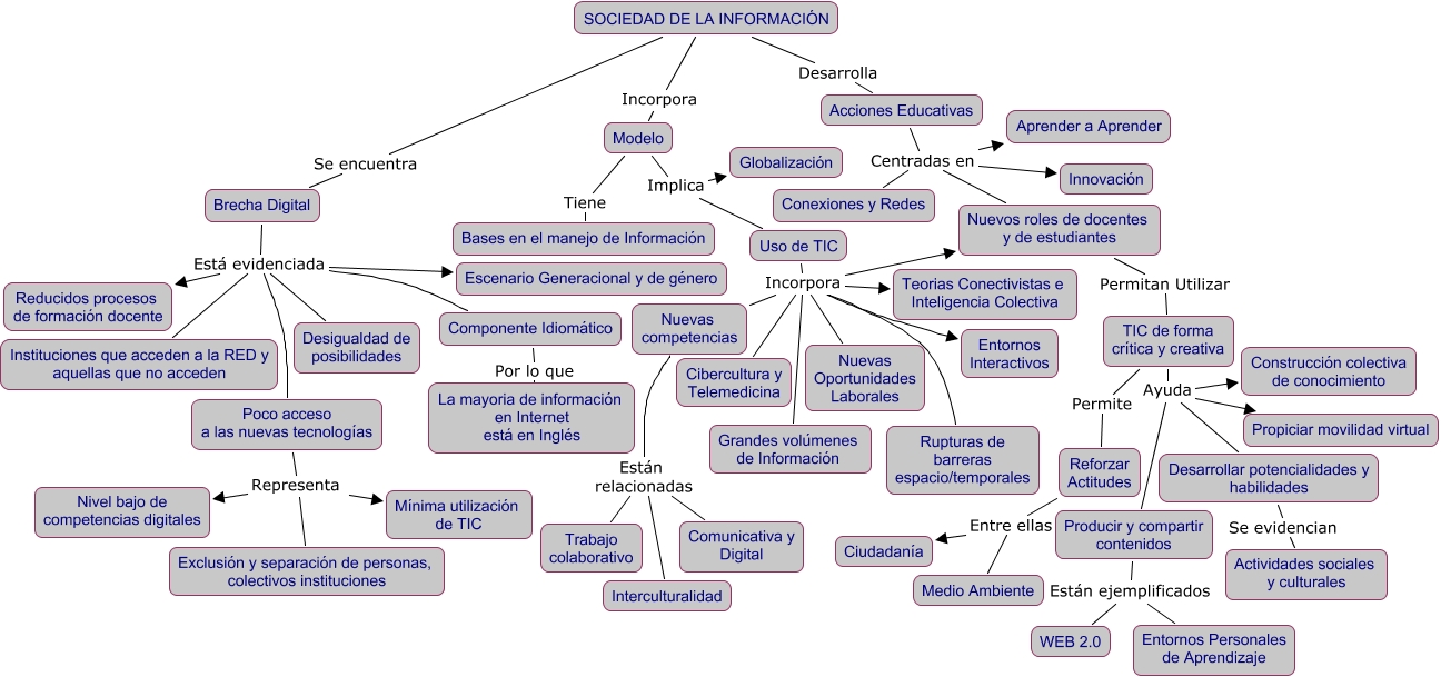 Este Cmap, tiene información relacionada con: SOCIEDAD DE LA INFORMACIÓN, Nuevos roles de docentes y de estudiantes Permitan Utilizar TIC de forma crítica y creativa, Uso de TIC Incorpora Nuevos roles de docentes y de estudiantes, Poco acceso a las nuevas tecnologías Representa Mínima utilización de TIC, Acciones Educativas Centradas en Innovación, SOCIEDAD DE LA INFORMACIÓN Desarrolla Acciones Educativas, TIC de forma crítica y creativa Ayuda Desarrollar potencialidades y habilidades, Nuevas competencias Están relacionadas Trabajo colaborativo, Acciones Educativas Centradas en Conexiones y Redes, Desarrollar potencialidades y habilidades Se evidencian Actividades sociales y culturales, Nuevas competencias Están relacionadas Comunicativa y Digital, Brecha Digital Está evidenciada Desigualdad de posibilidades, Reforzar Actitudes Entre ellas Ciudadanía, Producir y compartir contenidos Están ejemplificados Entornos Personales de Aprendizaje, Componente Idiomático Por lo que La mayoria de información en Internet está en Inglés, Modelo Implica Globalización, Uso de TIC Incorpora Nuevas competencias, Acciones Educativas Centradas en Aprender a Aprender, Uso de TIC Incorpora Teorias Conectivistas e Inteligencia Colectiva, TIC de forma crítica y creativa Ayuda Producir y compartir contenidos, TIC de forma crítica y creativa Ayuda Propiciar movilidad virtual