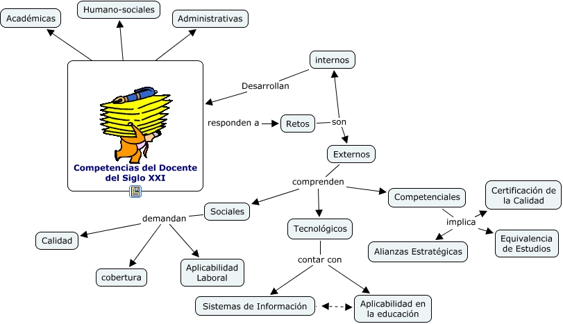 Este Cmap, tiene información relacionada con: competencias docentes, Competenciales implica Alianzas Estratégicas, Externos comprenden Tecnológicos, Externos comprenden Sociales, Sociales demandan cobertura, Retos son Externos, internos Desarrollan Competencias del Docente del Siglo XXI, Competencias del Docente del Siglo XXI responden a Retos, Competenciales implica Equivalencia de Estudios, Tecnológicos contar con Sistemas de Información, Competenciales implica Certificación de la Calidad, Retos son internos, Externos comprenden Competenciales, Competencias del Docente del Siglo XXI tipos Administrativas, Competencias del Docente del Siglo XXI tipos Académicas, Sociales demandan Aplicabilidad Laboral, Competencias del Docente del Siglo XXI tipos Humano-sociales, Tecnológicos contar con Aplicabilidad en la educación, Sociales demandan Calidad