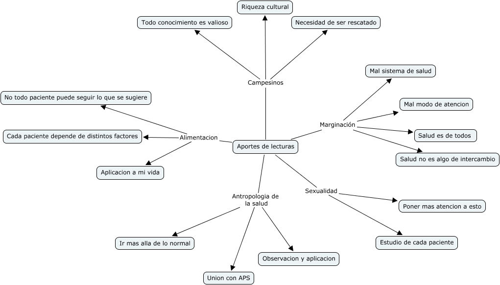 Este Cmap, tiene información relacionada con: Pregunta 2, Aportes de lecturas Alimentacion Cada paciente depende de distintos factores, Aportes de lecturas Marginación Salud no es algo de intercambio, Aportes de lecturas Antropologia de la salud Ir mas alla de lo normal, Aportes de lecturas Marginación Salud es de todos, Aportes de lecturas Sexualidad Poner mas atencion a esto, Aportes de lecturas Antropologia de la salud Union con APS, Aportes de lecturas Sexualidad Estudio de cada paciente, Aportes de lecturas Alimentacion No todo paciente puede seguir lo que se sugiere, Aportes de lecturas Campesinos Necesidad de ser rescatado, Aportes de lecturas Alimentacion Aplicacion a mi vida, Aportes de lecturas Marginación Mal sistema de salud, Aportes de lecturas Antropologia de la salud Observacion y aplicacion, Aportes de lecturas Campesinos Todo conocimiento es valioso, Aportes de lecturas Campesinos Riqueza cultural, Aportes de lecturas Marginación Mal modo de atencion