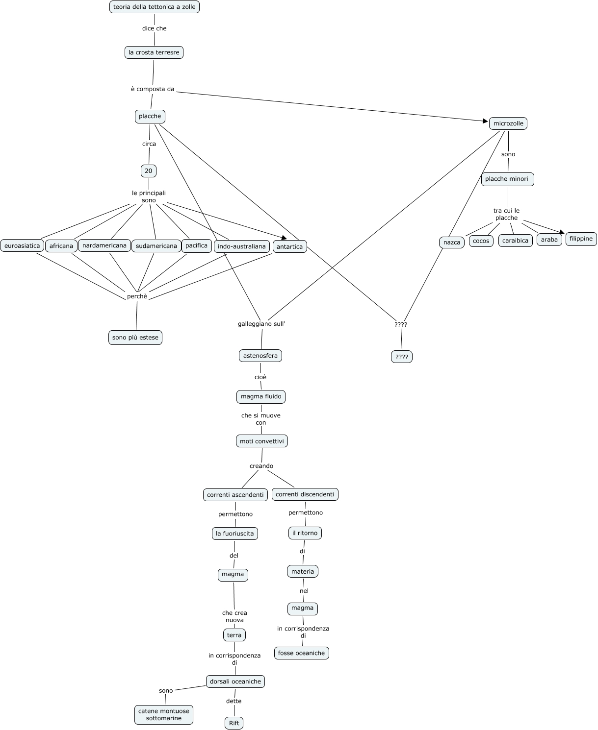 Questa Cmap, creata con IHMC CmapTools, contiene informazioni relative a: teoria tettonica a zolle, placche minori tra cui le placche nazca, dorsali oceaniche sono catene montuose sottomarine, 20 le principali sono pacifica, correnti ascendenti permettono la fuoriuscita, moti convettivi creando correnti discendenti, placche galleggiano sull' astenosfera, placche minori tra cui le placche araba, 20 le principali sono euroasiatica, microzolle galleggiano sull' astenosfera, africana perchè sono più estese, magma in corrispondenza di fosse oceaniche, la crosta terresre è composta da microzolle, 20 le principali sono antartica, nardamericana perchè sono più estese, magma fluido che si muove con moti convettivi, euroasiatica perchè sono più estese, teoria della tettonica a zolle dice che la crosta terresre, dorsali oceaniche dette Rift, 20 le principali sono indo-australiana, pacifica perchè sono più estese