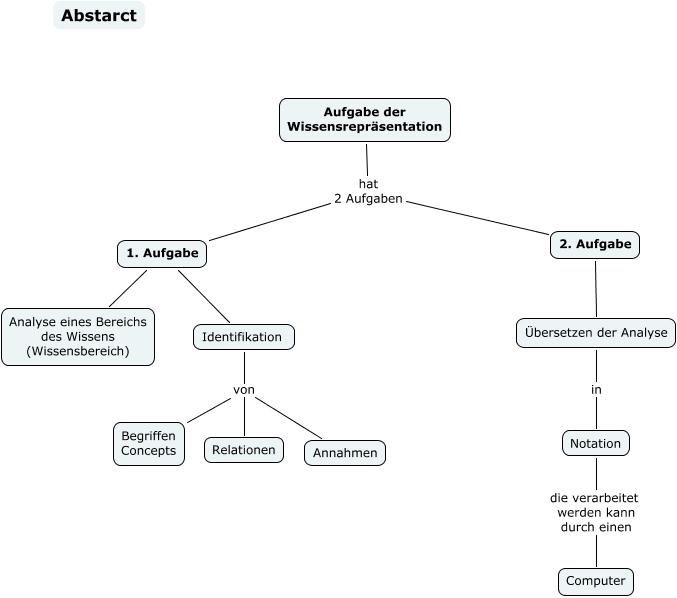 Dieses mit IHMC CmapTools erstellte CMap hat Informationen bezüglich: Aufgabe der Wissensrepräsentation, Aufgabe der Wissensrepräsentation hat 2 Aufgaben 1. Aufgabe, Notation die verarbeitet werden kann durch einen Computer, 1. Aufgabe Analyse eines Bereichs des Wissens (Wissensbereich), Übersetzen der Analyse in Notation, Identifikation von Annahmen, Identifikation von Relationen, Aufgabe der Wissensrepräsentation hat 2 Aufgaben 2. Aufgabe, 2. Aufgabe Übersetzen der Analyse, Identifikation von Begriffen Concepts, 1. Aufgabe Identifikation