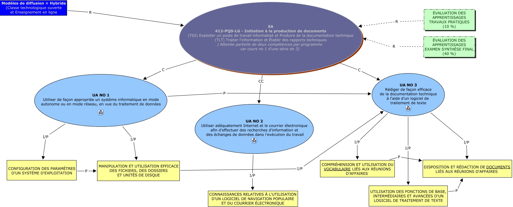 Cette carte de concepts créée avec IHMC CmapTools traite de: PQO_Courte_SA, UA NO 1 Utiliser de façon appropriée un système informatique en mode autonome ou en mode réseau, en vue du traitement de données P UA NO 3 Rédiger de façon efficace de la documentation technique à l'aide d'un logiciel de traitement de texte, UA NO 3 Rédiger de façon efficace de la documentation technique à l'aide d'un logiciel de traitement de texte I/P COMPRÉHENSION ET UTILISATION DU VOCABULAIRE LIÉS AUX RÉUNIONS D'AFFAIRES, UA NO 2 Utiliser adéquatement Internet et le courrier électronique afin d'effectuer des recherches d'information et des échanges de données dans l'exécution du travail I/P CONNAISSANCES RELATIVES À L'UTILISATION D'UN LOGICIEL DE NAVIGATION POPULAIRE ET DU COURRIER ÉLECTRONIQUE, ÉVALUATION DES APPRENTISSAGES TRAVAUX PRATIQUES (10 %) R SA 412-PQ0-LG - Initiation à la production de documents (TGI) Exploiter un poste de travail informatisé et Produire de la documentation technique (TLT) Traiter l'information et Établir des rapports techniques (Atteinte partielle de deux compétences par programme car cours no 1 d'une série de 3), SA 412-PQ0-LG - Initiation à la production de documents (TGI) Exploiter un poste de travail informatisé et Produire de la documentation technique (TLT) Traiter l'information et Établir des rapports techniques (Atteinte partielle de deux compétences par programme car cours no 1 d'une série de 3) C UA NO 1 Utiliser de façon appropriée un système informatique en mode autonome ou en mode réseau, en vue du traitement de données, SA 412-PQ0-LG - Initiation à la production de documents (TGI) Exploiter un poste de travail informatisé et Produire de la documentation technique (TLT) Traiter l'information et Établir des rapports techniques (Atteinte partielle de deux compétences par programme car cours no 1 d'une série de 3) CC UA NO 2 Utiliser adéquatement Internet et le courrier électronique afin d'effectuer des recherches d'information et des échanges de données dans l'exécution du travail, COMPRÉHENSION ET UTILISATION DU VOCABULAIRE LIÉS AUX RÉUNIONS D'AFFAIRES P DISPOSITION ET RÉDACTION DE DOCUMENTS LIÉS AUX RÉUNIONS D'AFFAIRES, Modèles de diffusion = Hybride (Classe technologique ouverte et Enseignement en ligne R SA 412-PQ0-LG - Initiation à la production de documents (TGI) Exploiter un poste de travail informatisé et Produire de la documentation technique (TLT) Traiter l'information et Établir des rapports techniques (Atteinte partielle de deux compétences par programme car cours no 1 d'une série de 3), CONFIGURATION DES PARAMÈTRES D'UN SYSTÈME D'EXPLOITATION P MANIPULATION ET UTILISATION EFFICACE DES FICHIERS, DES DOSSIERS ET UNITÉS DE DISQUE, UA NO 3 Rédiger de façon efficace de la documentation technique à l'aide d'un logiciel de traitement de texte I/P DISPOSITION ET RÉDACTION DE DOCUMENTS LIÉS AUX RÉUNIONS D'AFFAIRES, MANIPULATION ET UTILISATION EFFICACE DES FICHIERS, DES DOSSIERS ET UNITÉS DE DISQUE I/P UA NO 3 Rédiger de façon efficace de la documentation technique à l'aide d'un logiciel de traitement de texte, ÉVALUATION DES APPRENTISSAGES EXAMEN SYNTHÈSE FINAL (40 %) R SA 412-PQ0-LG - Initiation à la production de documents (TGI) Exploiter un poste de travail informatisé et Produire de la documentation technique (TLT) Traiter l'information et Établir des rapports techniques (Atteinte partielle de deux compétences par programme car cours no 1 d'une série de 3), UA NO 3 Rédiger de façon efficace de la documentation technique à l'aide d'un logiciel de traitement de texte I/P UTILISATION DES FONCTIONS DE BASE, INTERMÉDIAIRES ET AVANCÉES D'UN LOGICIEL DE TRAITEMENT DE TEXTE, UTILISATION DES FONCTIONS DE BASE, INTERMÉDIAIRES ET AVANCÉES D'UN LOGICIEL DE TRAITEMENT DE TEXTE P DISPOSITION ET RÉDACTION DE DOCUMENTS LIÉS AUX RÉUNIONS D'AFFAIRES, UA NO 1 Utiliser de façon appropriée un système informatique en mode autonome ou en mode réseau, en vue du traitement de données I/P CONFIGURATION DES PARAMÈTRES D'UN SYSTÈME D'EXPLOITATION, UA NO 1 Utiliser de façon appropriée un système informatique en mode autonome ou en mode réseau, en vue du traitement de données I/P MANIPULATION ET UTILISATION EFFICACE DES FICHIERS, DES DOSSIERS ET UNITÉS DE DISQUE, SA 412-PQ0-LG - Initiation à la production de documents (TGI) Exploiter un poste de travail informatisé et Produire de la documentation technique (TLT) Traiter l'information et Établir des rapports techniques (Atteinte partielle de deux compétences par programme car cours no 1 d'une série de 3) C UA NO 3 Rédiger de façon efficace de la documentation technique à l'aide d'un logiciel de traitement de texte