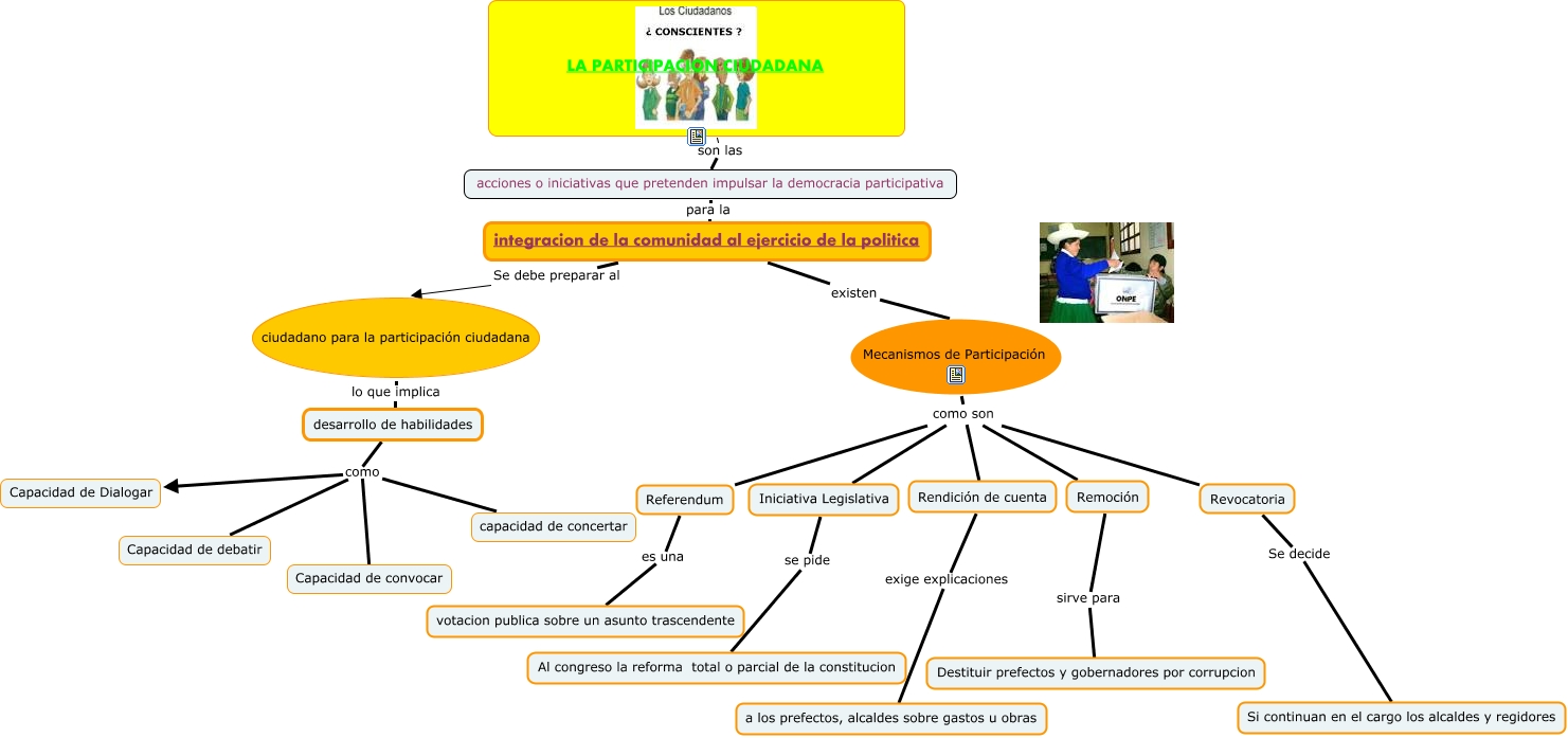 Este Cmap, tiene información relacionada con: participacion ciudadana, integracion de la comunidad al ejercicio de la politica Se debe preparar al ciudadano para la participación ciudadana, acciones o iniciativas que pretenden impulsar la democracia participativa para la integracion de la comunidad al ejercicio de la politica, Rendición de cuenta exige explicaciones a los prefectos, alcaldes sobre gastos u obras, Mecanismos de Participación como son Iniciativa Legislativa, Mecanismos de Participación como son Rendición de cuenta, Revocatoria Se decide Si continuan en el cargo los alcaldes y regidores, Remoción sirve para Destituir prefectos y gobernadores por corrupcion, desarrollo de habilidades como Capacidad de debatir, integracion de la comunidad al ejercicio de la politica existen Mecanismos de Participación, desarrollo de habilidades como capacidad de concertar, LA PARTICIPACION CIUDADANA son las acciones o iniciativas que pretenden impulsar la democracia participativa, Mecanismos de Participación como son Remoción, Mecanismos de Participación como son Revocatoria, desarrollo de habilidades como Capacidad de Dialogar, ciudadano para la participación ciudadana lo que implica desarrollo de habilidades, Referendum es una votacion publica sobre un asunto trascendente, desarrollo de habilidades como Capacidad de convocar, Iniciativa Legislativa se pide Al congreso la reforma total o parcial de la constitucion, Mecanismos de Participación como son Referendum