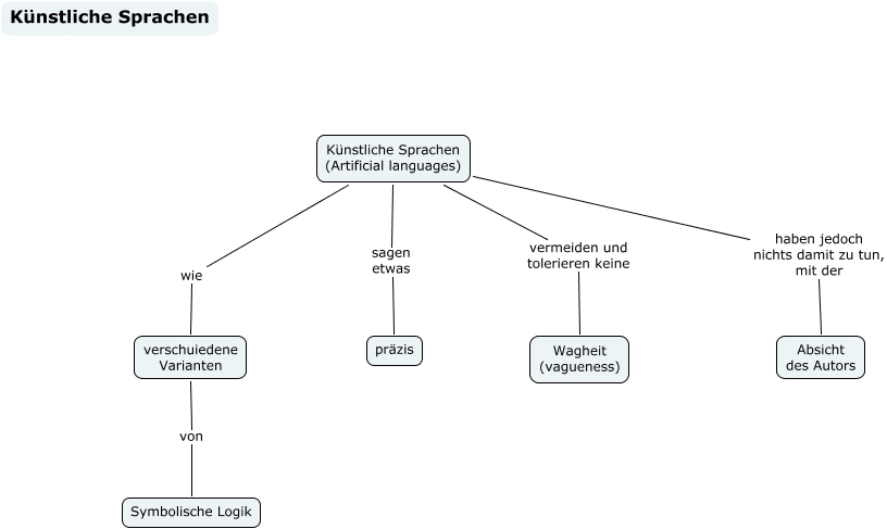 Dieses mit IHMC CmapTools erstellte CMap hat Informationen bezüglich: Künstliche Sprachen, Künstliche Sprachen (Artificial languages) haben jedoch nichts damit zu tun, mit der Absicht des Autors, Künstliche Sprachen (Artificial languages) sagen etwas präzis, verschuiedene Varianten von Symbolische Logik, Künstliche Sprachen (Artificial languages) wie verschuiedene Varianten, Künstliche Sprachen (Artificial languages) vermeiden und tolerieren keine Wagheit (vagueness)