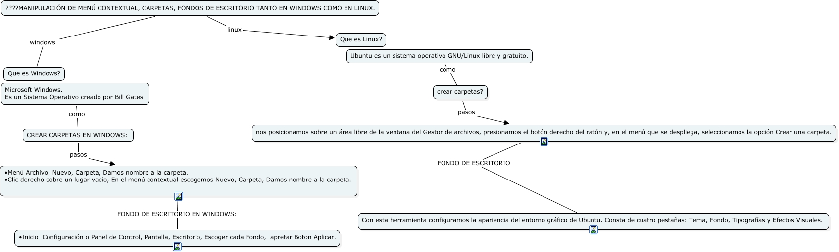 This Concept Map, created with IHMC CmapTools, has information related to: TRABAJO DE INFORMATICA, crear carpetas? pasos nos posicionamos sobre un área libre de la ventana del Gestor de archivos, presionamos el botón derecho del ratón y, en el menú que se despliega, seleccionamos la opción Crear una carpeta., • Menú Archivo, Nuevo, Carpeta, Damos nombre a la carpeta. • Clic derecho sobre un lugar vacío, En el menú contextual escogemos Nuevo, Carpeta, Damos nombre a la carpeta. FONDO DE ESCRITORIO EN WINDOWS: • Inicio Configuración o Panel de Control, Pantalla, Escritorio, Escoger cada Fondo, apretar Boton Aplicar., nos posicionamos sobre un área libre de la ventana del Gestor de archivos, presionamos el botón derecho del ratón y, en el menú que se despliega, seleccionamos la opción Crear una carpeta. FONDO DE ESCRITORIO Con esta herramienta configuramos la apariencia del entorno gráfico de Ubuntu. Consta de cuatro pestañas: Tema, Fondo, Tipografías y Efectos Visuales., Microsoft Windows. Es un Sistema Operativo creado por Bill Gates como CREAR CARPETAS EN WINDOWS:, ????MANIPULACIÓN DE MENÚ CONTEXTUAL, CARPETAS, FONDOS DE ESCRITORIO TANTO EN WINDOWS COMO EN LINUX. linux Que es Linux?, ????MANIPULACIÓN DE MENÚ CONTEXTUAL, CARPETAS, FONDOS DE ESCRITORIO TANTO EN WINDOWS COMO EN LINUX. windows Que es Windows?, CREAR CARPETAS EN WINDOWS: pasos • Menú Archivo, Nuevo, Carpeta, Damos nombre a la carpeta. • Clic derecho sobre un lugar vacío, En el menú contextual escogemos Nuevo, Carpeta, Damos nombre a la carpeta., Ubuntu es un sistema operativo GNU/Linux libre y gratuito. como crear carpetas?