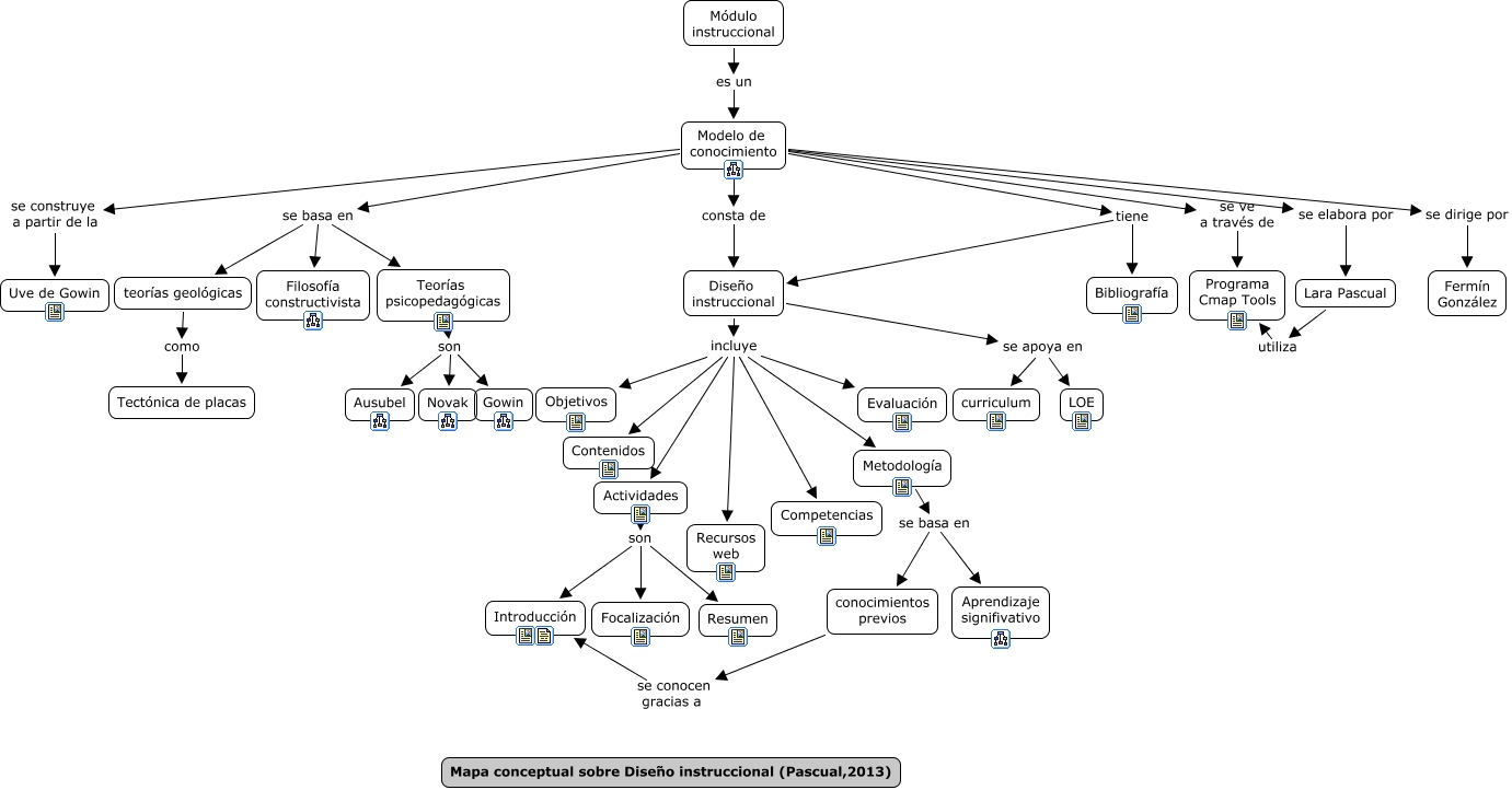 Este Cmap, tiene información relacionada con: MÓDULO INSTRUCCIONAL, Modelo de conocimiento tiene Diseño instruccional, Metodología se basa en conocimientos previos, Modelo de conocimiento se basa en teorías geológicas, Modelo de conocimiento se dirige por Fermín González, Teorías psicopedagógicas son Gowin, Modelo de conocimiento se construye a partir de la Uve de Gowin, Modelo de conocimiento se basa en Filosofía constructivista, Actividades son Introducción, Diseño instruccional se apoya en LOE, Lara Pascual utiliza Programa Cmap Tools, Metodología se basa en Aprendizaje signifivativo, teorías geológicas como Tectónica de placas, Diseño instruccional incluye Recursos web, Modelo de conocimiento consta de Diseño instruccional, Módulo instruccional es un Modelo de conocimiento, Modelo de conocimiento se ve a través de Programa Cmap Tools, Diseño instruccional incluye Actividades, Diseño instruccional incluye Contenidos, Teorías psicopedagógicas son Novak, Modelo de conocimiento se basa en Teorías psicopedagógicas