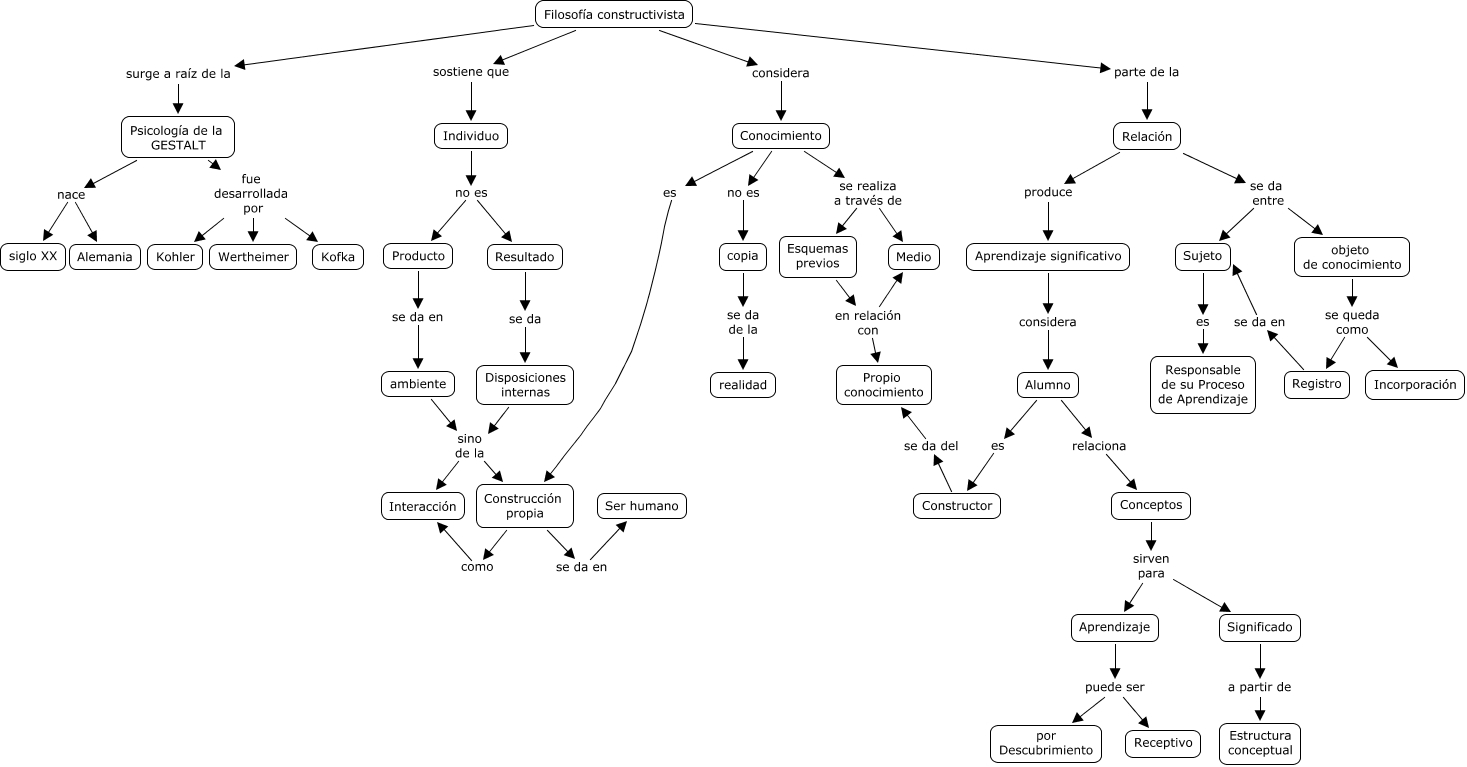 Este Cmap, tiene información relacionada con: filosofia constructivista, Significado a partir de Estructura conceptual, Individuo no es Resultado, Resultado se da Disposiciones internas, Producto se da en ambiente, Disposiciones internas sino de la Construcción propia, Psicología de la GESTALT nace Alemania, Esquemas previos en relación con Propio conocimiento, Disposiciones internas sino de la Interacción, objeto de conocimiento se queda como Incorporación, ambiente sino de la Interacción, Conceptos sirven para Significado, Aprendizaje significativo considera Alumno, Conocimiento se realiza a través de Esquemas previos, Psicología de la GESTALT nace siglo XX, Sujeto es Responsable de su Proceso de Aprendizaje, objeto de conocimiento se queda como Registro, Conocimiento es Construcción propia, Registro se da en Sujeto, Relación se da entre Sujeto, Psicología de la GESTALT fue desarrollada por Kohler