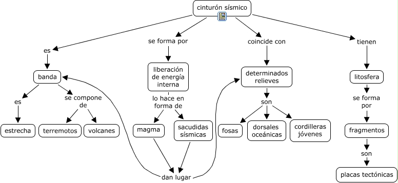 Este Cmap, tiene información relacionada con: cinturón sísmico, cinturón sísmico tienen litosfera, determinados relieves son fosas, sacudidas sísmicas dan lugar banda, fragmentos son placas tectónicas, determinados relieves son cordilleras jóvenes, banda es estrecha, liberación de energía interna lo hace en forma de sacudidas sísmicas, magma dan lugar banda, cinturón sísmico es banda, litosfera se forma por fragmentos, banda se compone de volcanes, liberación de energía interna lo hace en forma de magma, banda se compone de terremotos, sacudidas sísmicas dan lugar determinados relieves, cinturón sísmico coincide con determinados relieves, determinados relieves son dorsales oceánicas, cinturón sísmico se forma por liberación de energía interna, magma dan lugar determinados relieves