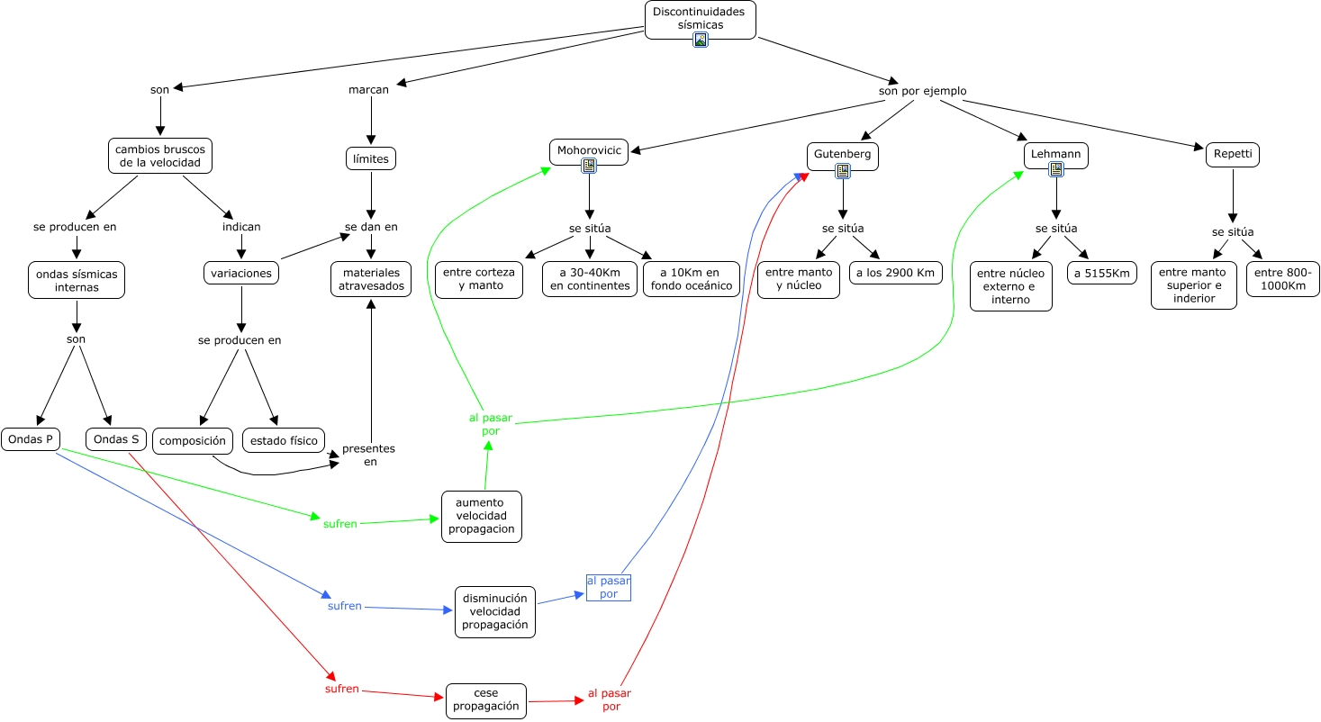Este Cmap, tiene información relacionada con: discontinuidades, cese propagación al pasar por Gutenberg, Lehmann se sitúa a 5155Km, disminución velocidad propagación al pasar por Gutenberg, Mohorovicic se sitúa entre corteza y manto, Gutenberg se sitúa entre manto y núcleo, Ondas P sufren aumento velocidad propagacion, ondas sísmicas internas son Ondas P, Discontinuidades sísmicas son por ejemplo Lehmann, Discontinuidades sísmicas son por ejemplo Mohorovicic, Ondas P sufren disminución velocidad propagación, Discontinuidades sísmicas son por ejemplo Repetti, cambios bruscos de la velocidad se producen en ondas sísmicas internas, variaciones se producen en estado físico, Repetti se sitúa entre 800- 1000Km, variaciones se dan en materiales atravesados, cambios bruscos de la velocidad indican variaciones, Ondas S sufren cese propagación, Mohorovicic se sitúa a 10Km en fondo oceánico, aumento velocidad propagacion al pasar por Lehmann, ondas sísmicas internas son Ondas S