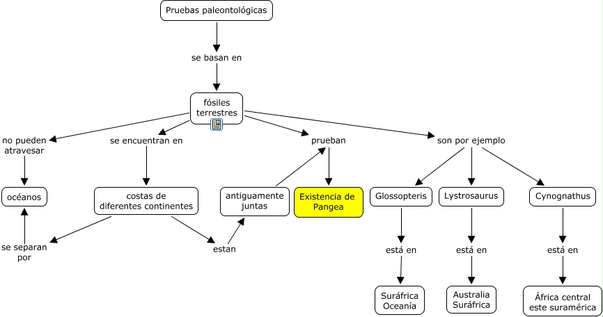 Este Cmap, tiene información relacionada con: pruebas paleontologicas, fósiles terrestres no pueden atravesar océanos, fósiles terrestres prueban Existencia de Pangea, antiguamente juntas prueban Existencia de Pangea, fósiles terrestres son por ejemplo Glossopteris, costas de diferentes continentes estan antiguamente juntas, Pruebas paleontológicas se basan en fósiles terrestres, fósiles terrestres son por ejemplo Cynognathus, Lystrosaurus está en Australia Suráfrica, fósiles terrestres se encuentran en costas de diferentes continentes, Glossopteris está en Suráfrica Oceanía, fósiles terrestres son por ejemplo Lystrosaurus, costas de diferentes continentes se separan por océanos, Cynognathus está en África central este suramérica
