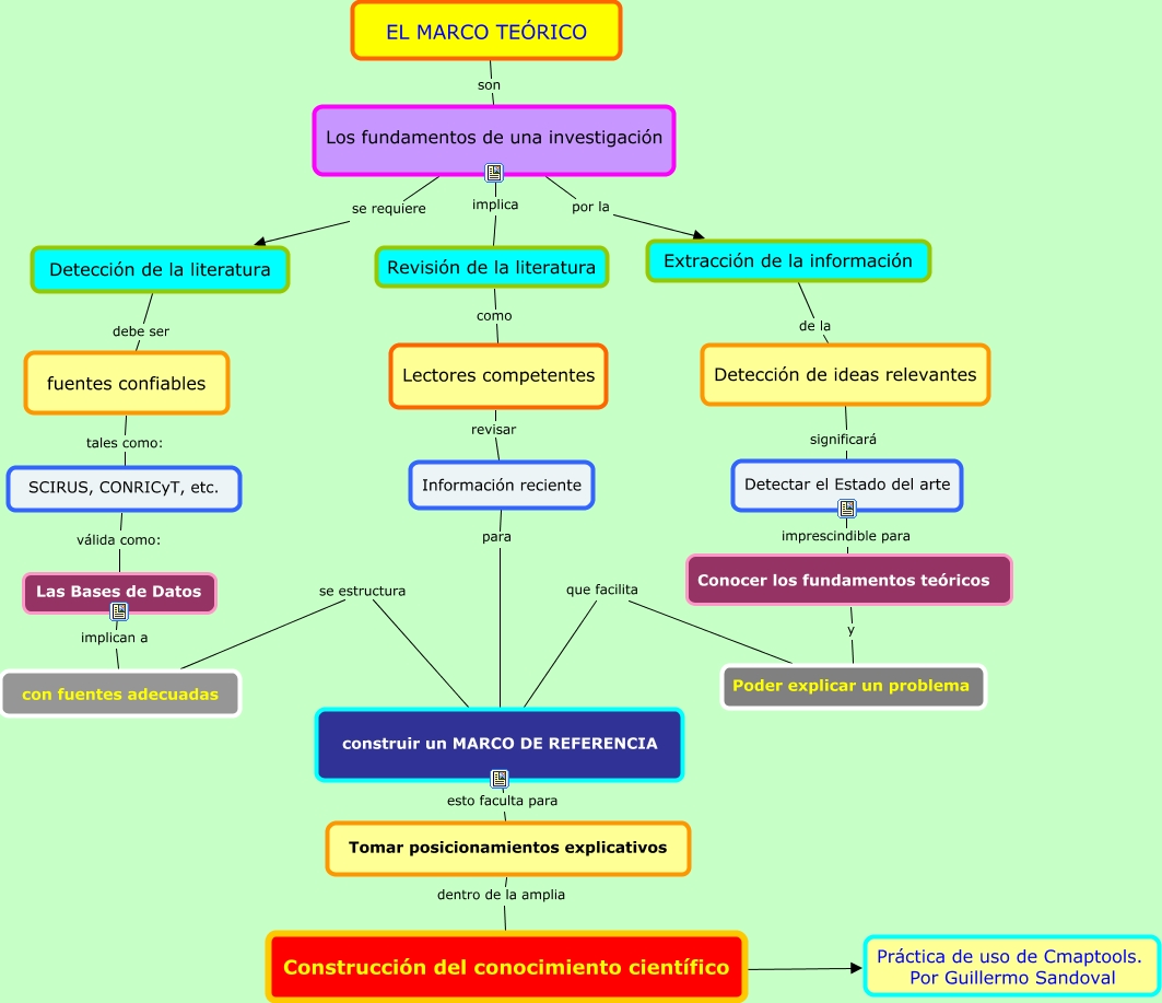 Este Cmap, tiene información relacionada con: Marco teórico. Cmaptools, Construcción del conocimiento científico ???? Práctica de uso de Cmaptools. Por Guillermo Sandoval, Revisión de la literatura como Lectores competentes, construir un MARCO DE REFERENCIA que facilita Poder explicar un problema, fuentes confiables tales como: SCIRUS, CONRICyT, etc., Información reciente para construir un MARCO DE REFERENCIA, Detectar el Estado del arte imprescindible para Conocer los fundamentos teóricos, Los fundamentos de una investigación por la Extracción de la información, Lectores competentes revisar Información reciente, Extracción de la información de la Detección de ideas relevantes, EL MARCO TEÓRICO son Los fundamentos de una investigación, Los fundamentos de una investigación implica Revisión de la literatura, construir un MARCO DE REFERENCIA se estructura con fuentes adecuadas, Detección de la literatura debe ser fuentes confiables, SCIRUS, CONRICyT, etc. válida como: Las Bases de Datos, Conocer los fundamentos teóricos y Poder explicar un problema, Tomar posicionamientos explicativos dentro de la amplia Construcción del conocimiento científico, Los fundamentos de una investigación se requiere Detección de la literatura, Detección de ideas relevantes significará Detectar el Estado del arte, construir un MARCO DE REFERENCIA esto faculta para Tomar posicionamientos explicativos, Las Bases de Datos implican a con fuentes adecuadas