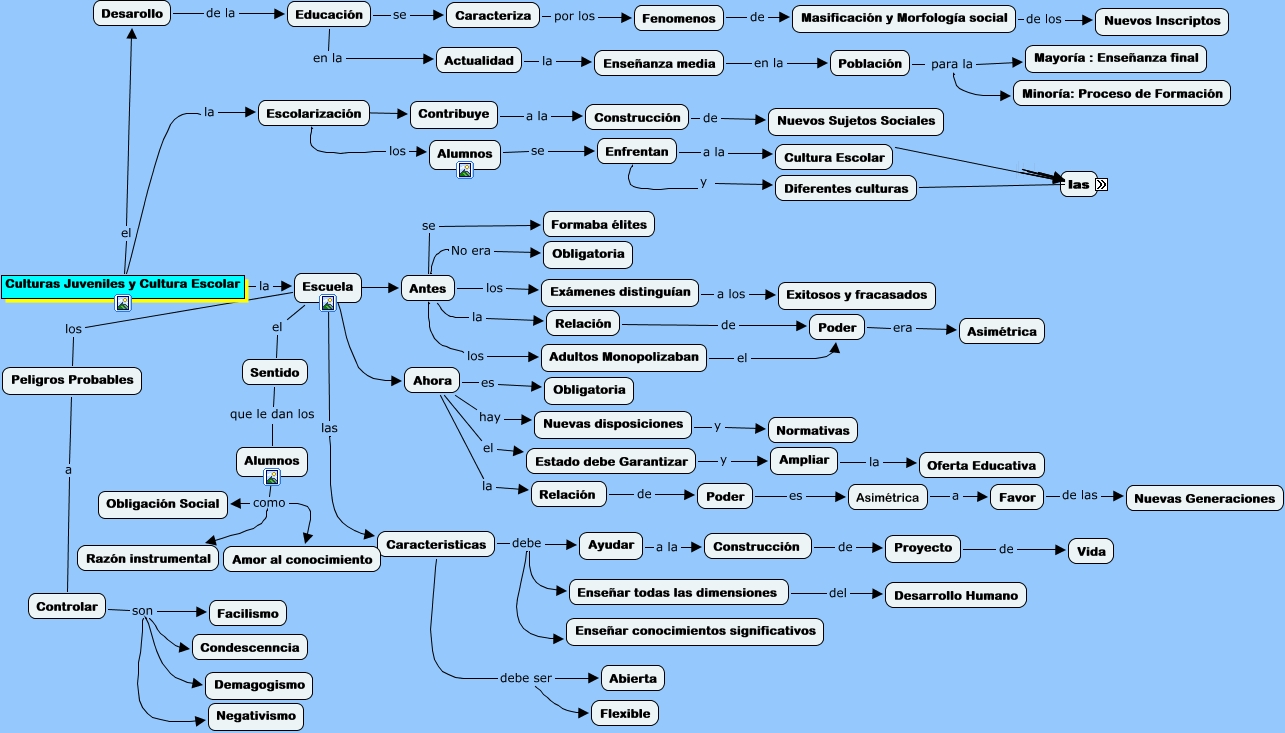 Este Cmap, tiene información relacionada con: Cultura Juveniles y Cultura Escolar, Controlar son Negativismo, Provocan Frustraciones, Culturas Juveniles y Cultura Escolar la Escolarización, Ahora la Relación, Ahora es Obligatoria, Proyecto de Vida, Población para la Mayoría : Enseñanza final, Asimétrica a Favor, Exámenes distinguían a los Exitosos y fracasados, Enseñanza media en la Población, Enfrentan y Diferentes culturas, Enfrentan a la Cultura Escolar, Alumnos se Enfrentan, Controlar son Condescenncia, Provocan Desencantos, Poder era Asimétrica, Alumnos como Razón instrumental, Alumnos como Obligación Social, Ampliar la Oferta Educativa, Escuela el Sentido