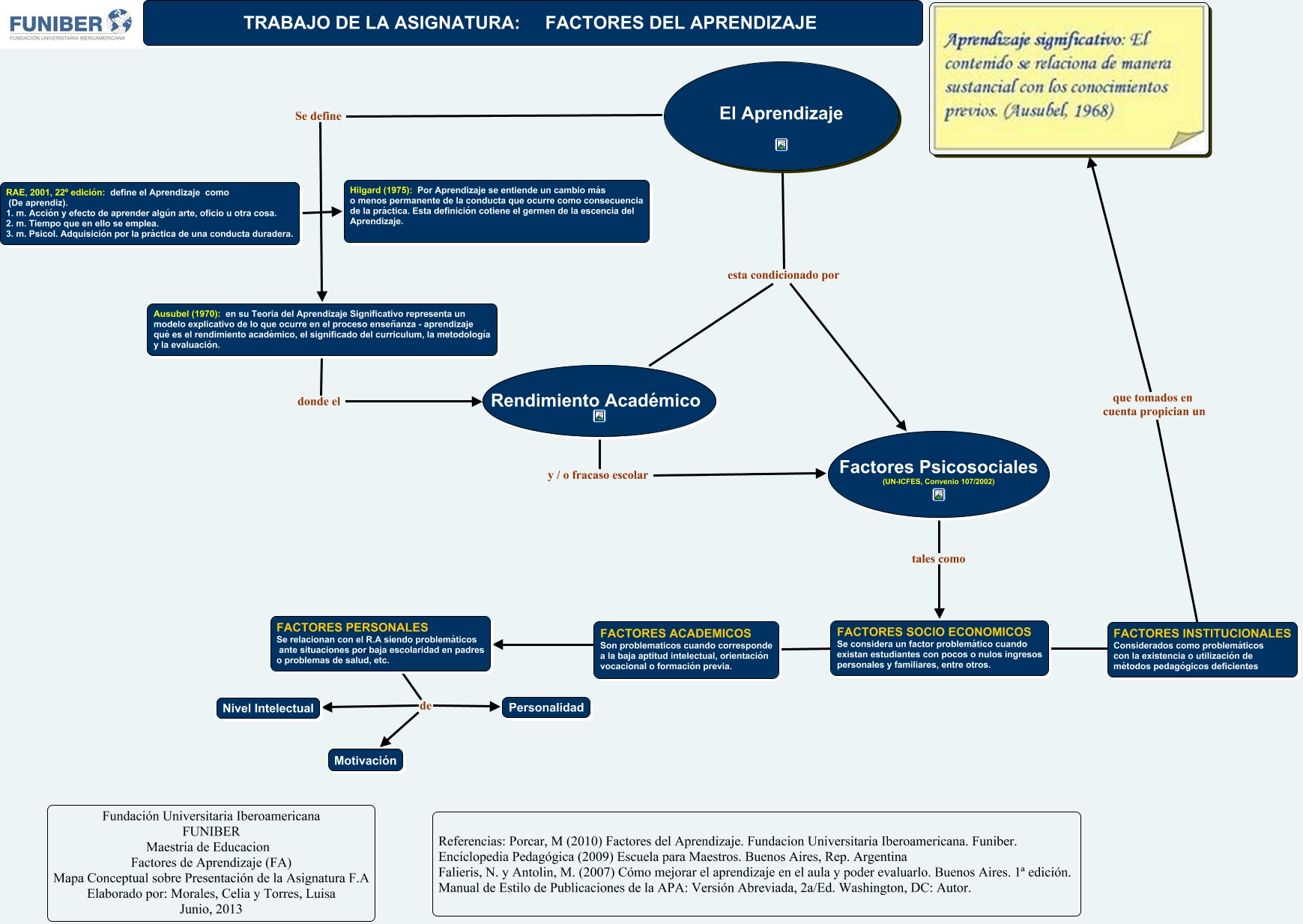 Este Cmap, tiene información relacionada con: 2013-02LTorresCMorales_FA, FACTORES SOCIO ECONOMICOS Se considera un factor problemático cuando existan estudiantes con pocos o nulos ingresos personales y familiares, entre otros. ???? FACTORES INSTITUCIONALES Considerados como problemáticos con la existencia o utilización de métodos pedagógicos deficientes, FACTORES ACADEMICOS Son problematicos cuando corresponde a la baja aptitud intelectual, orientación vocacional o formación previa. ???? FACTORES SOCIO ECONOMICOS Se considera un factor problemático cuando existan estudiantes con pocos o nulos ingresos personales y familiares, entre otros., FACTORES ACADEMICOS Son problematicos cuando corresponde a la baja aptitud intelectual, orientación vocacional o formación previa. ???? FACTORES PERSONALES Se relacionan con el R.A siendo problemáticos ante situaciones por baja escolaridad en padres o problemas de salud, etc., FACTORES PERSONALES Se relacionan con el R.A siendo problemáticos ante situaciones por baja escolaridad en padres o problemas de salud, etc. de Nivel Intelectual, Rendimiento Académico esta condicionado por Factores Psicosociales (UN-ICFES, Convenio 107/2002), Rendimiento Académico y / o fracaso escolar Factores Psicosociales (UN-ICFES, Convenio 107/2002), Ausubel (1970): en su Teoria del Aprendizaje Significativo representa un modelo explicativo de lo que ocurre en el proceso enseñanza - aprendizaje qué es el rendimiento académico, el significado del curriculum, la metodología y la evaluación. donde el ????, RAE, 2001, 22º edición: define el Aprendizaje como (De aprendiz). 1. m. Acción y efecto de aprender algún arte, oficio u otra cosa. 2. m. Tiempo que en ello se emplea. 3. m. Psicol. Adquisición por la práctica de una conducta duradera. ???? Hilgard (1975): Por Aprendizaje se entiende un cambio más o menos permanente de la conducta que ocurre como consecuencia de la práctica. Esta definición cotiene el germen de la escencia del Aprendizaje., FACTORES PERSONALES Se relacionan con el R.A siendo problemáticos ante situaciones por baja escolaridad en padres o problemas de salud, etc. de Motivación, FACTORES PERSONALES Se relacionan con el R.A siendo problemáticos ante situaciones por baja escolaridad en padres o problemas de salud, etc. de Personalidad, Factores Psicosociales (UN-ICFES, Convenio 107/2002) tales como FACTORES SOCIO ECONOMICOS Se considera un factor problemático cuando existan estudiantes con pocos o nulos ingresos personales y familiares, entre otros., FACTORES INSTITUCIONALES Considerados como problemáticos con la existencia o utilización de métodos pedagógicos deficientes que tomados en cuenta propician un, El Aprendizaje esta condicionado por Factores Psicosociales (UN-ICFES, Convenio 107/2002), El Aprendizaje Se define Ausubel (1970): en su Teoria del Aprendizaje Significativo representa un modelo explicativo de lo que ocurre en el proceso enseñanza - aprendizaje qué es el rendimiento académico, el significado del curriculum, la metodología y la evaluación.