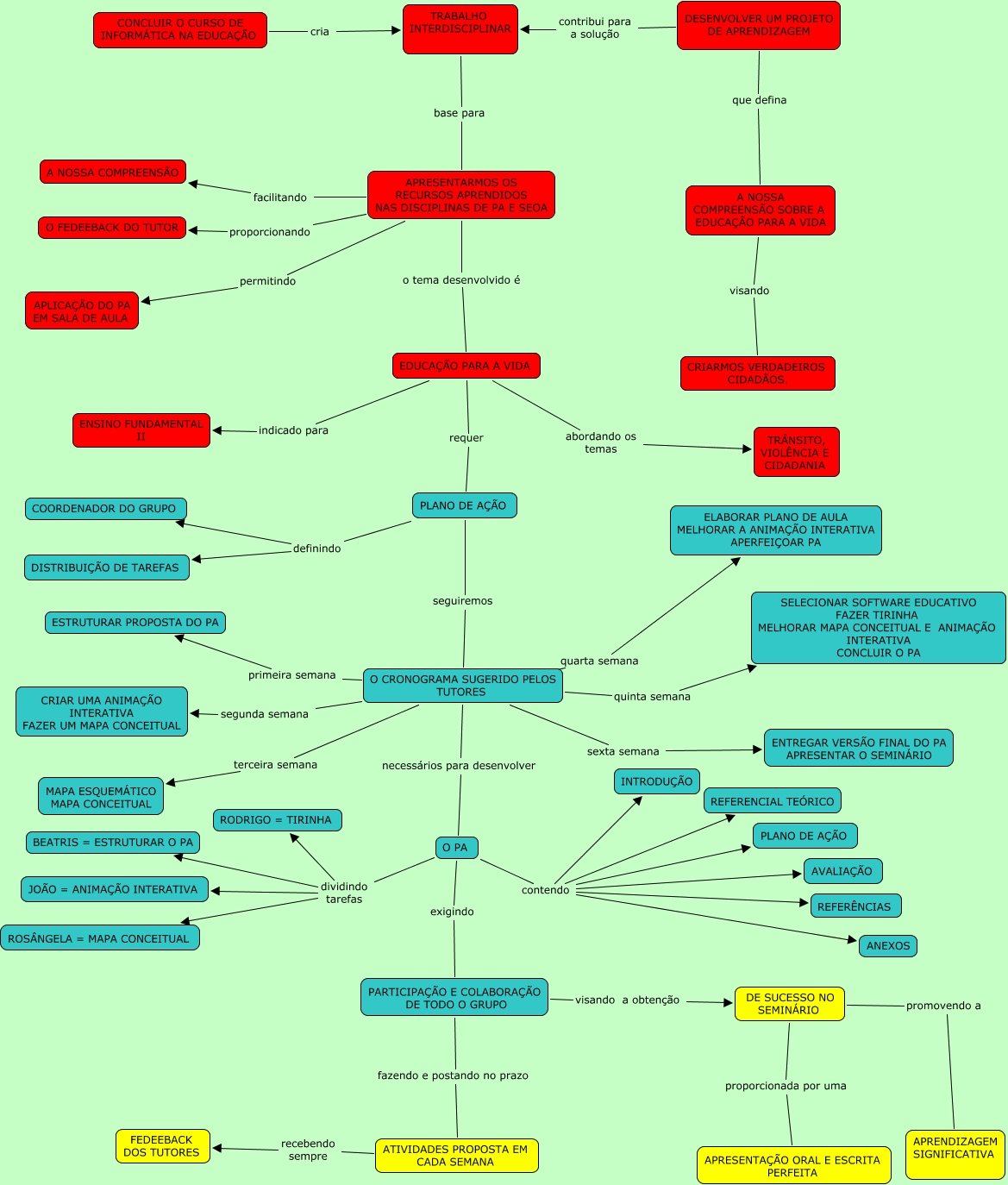 Esse mapa conceitual, produzido no IHMC CmapTools, tem a informação relacionada a: MAPA_ESQUEMATICO_GRUPO2, DESENVOLVER UM PROJETO DE APRENDIZAGEM contribui para a solução TRABALHO INTERDISCIPLINAR, O PA exigindo PARTICIPAÇÃO E COLABORAÇÃO DE TODO O GRUPO, O CRONOGRAMA SUGERIDO PELOS TUTORES segunda semana CRIAR UMA ANIMAÇÃO INTERATIVA FAZER UM MAPA CONCEITUAL, O PA dividindo tarefas JOÃO = ANIMAÇÃO INTERATIVA, APRESENTARMOS OS RECURSOS APRENDIDOS NAS DISCIPLINAS DE PA E SEOA permitindo APLICAÇÃO DO PA EM SALA DE AULA, O CRONOGRAMA SUGERIDO PELOS TUTORES quarta semana ELABORAR PLANO DE AULA MELHORAR A ANIMAÇÃO INTERATIVA APERFEIÇOAR PA, PLANO DE AÇÃO definindo DISTRIBUIÇÃO DE TAREFAS, O CRONOGRAMA SUGERIDO PELOS TUTORES sexta semana ENTREGAR VERSÃO FINAL DO PA APRESENTAR O SEMINÁRIO, DE SUCESSO NO SEMINÁRIO proporcionada por uma APRESENTAÇÃO ORAL E ESCRITA PERFEITA, APRESENTARMOS OS RECURSOS APRENDIDOS NAS DISCIPLINAS DE PA E SEOA facilitando A NOSSA COMPREENSÃO, O CRONOGRAMA SUGERIDO PELOS TUTORES necessários para desenvolver O PA, O PA contendo ANEXOS, CONCLUIR O CURSO DE INFORMÁTICA NA EDUCAÇÃO cria TRABALHO INTERDISCIPLINAR, O CRONOGRAMA SUGERIDO PELOS TUTORES primeira semana ESTRUTURAR PROPOSTA DO PA, O PA dividindo tarefas RODRIGO = TIRINHA, PLANO DE AÇÃO definindo COORDENADOR DO GRUPO, EDUCAÇÃO PARA A VIDA indicado para ENSINO FUNDAMENTAL II, O CRONOGRAMA SUGERIDO PELOS TUTORES quinta semana SELECIONAR SOFTWARE EDUCATIVO FAZER TIRINHA MELHORAR MAPA CONCEITUAL E ANIMAÇÃO INTERATIVA CONCLUIR O PA, O PA contendo PLANO DE AÇÃO, O CRONOGRAMA SUGERIDO PELOS TUTORES terceira semana MAPA ESQUEMÁTICO MAPA CONCEITUAL