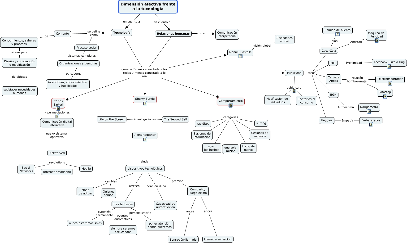 Este Cmap, tiene información relacionada con: TECNOLOGIA FINAL definitivo, tres fantasías oyentes automáticos siempre seremos escuchados, Sherry Turkle investigaciones The Second Self, Manuel Castells visión global Sociedades en red, Publicidad casos Huggies, Comportamiento categorías rapiditos, Proceso social sistemas complejos Organizaciones y personas, Tecnología generación más conectada a las redes y menos conectada a lo real Publicidad, tres fantasías conexión permanente nunca estaremos solos, Conjunto de Conocimientos, saberes y procesos, Comportamiento categorías surfing, Tecnología generación más conectada a las redes y menos conectada a lo real Sherry Turkle, Comportamiento categorías una sola misión, Publicidad casos MIT, Comunicación digital interactiva nuevo sistema operativo Networked, tres fantasías personalización poner atención donde queremos, dispositivos tecnológicos pone en duda Capacidad de autoreflexión, Tecnología generación más conectada a las redes y menos conectada a lo real Manuel Castells, Organizaciones y personas portadores intenciones, conocimientos y habilidades, Carlos Sartori Hipermediaciones Comunicación digital interactiva, Diseño y construcción o modificación de objetos satisfacer necesidades humanas