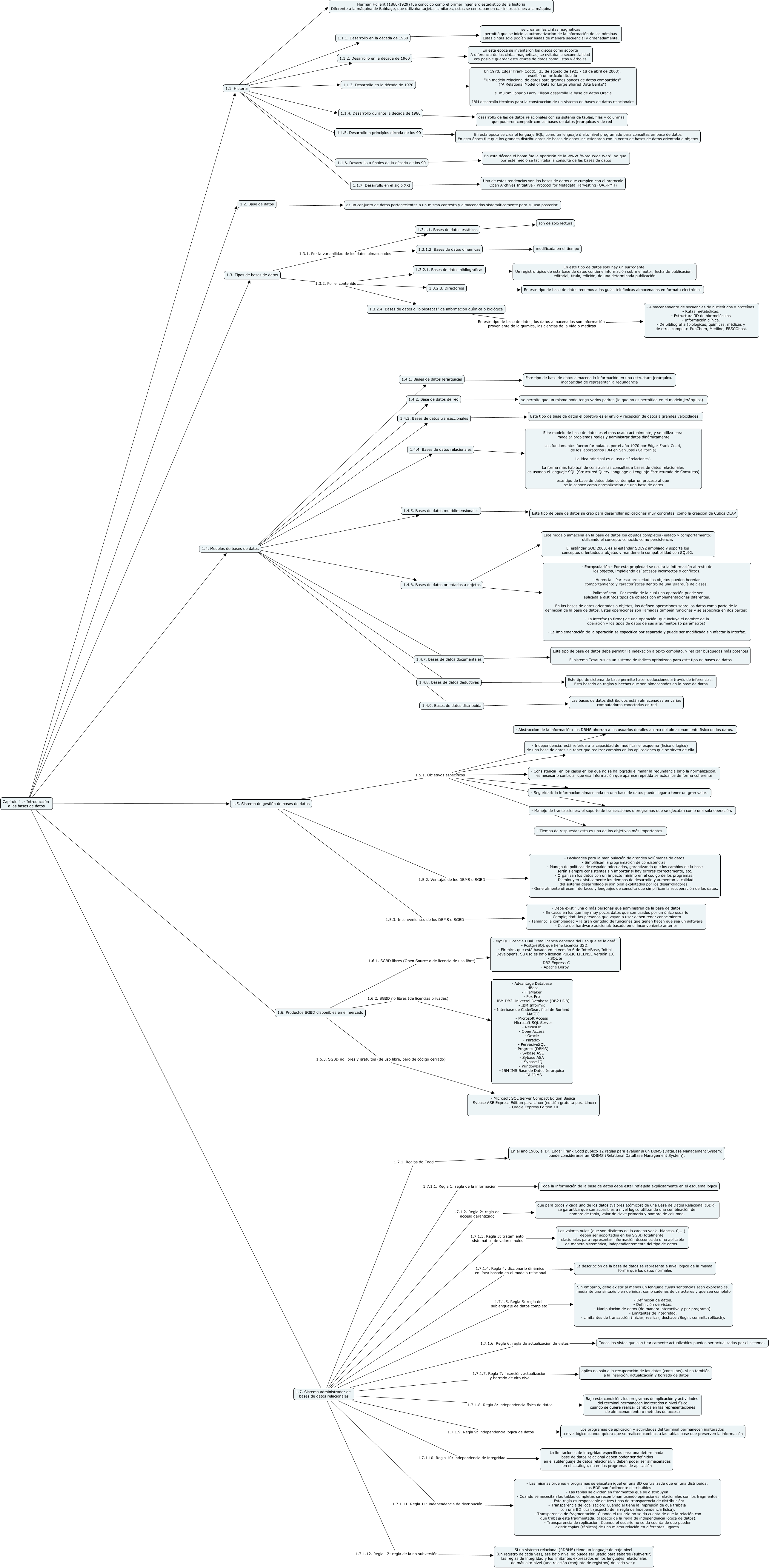 Este Cmap, tiene información relacionada con: Capítulo 1 .- Introducción a las bases de datos, Capítulo 1 .- Introducción a las bases de datos ???? 1.6. Productos SGBD disponibles en el mercado, 1.3.1.1. Bases de datos estáticas ???? son de solo lectura, 1.4.2. Base de datos de red ???? se permite que un mismo nodo tenga varios padres (lo que no es permitida en el modelo jerárquico)., Capítulo 1 .- Introducción a las bases de datos ???? 1.3. Tipos de bases de datos, 1.1. Historia CONTENIDO 1.1.5. Desarrollo a principios década de los 90, 1.5. Sistema de gestión de bases de datos 1.5.1. Objetivos específicos - Tiempo de respuesta: esta es una de los objetivos más importantes., 1.4. Modelos de bases de datos ???? 1.4.8. Bases de datos deductivas, 1.4.5. Bases de datos multidimensionales ???? Este tipo de base de datos se creó para desarrollar aplicaciones muy concretas, como la creación de Cubos OLAP, 1.7. Sistema administrador de bases de datos relacionales 1.7.1.12. Regla 12: regla de la no subversión Si un sistema relacional (RDBMS) tiene un lenguaje de bajo nivel (un registro de cada vez), ese bajo nivel no puede ser usado para saltarse (subvertir) las reglas de integridad y los limitantes expresados en los lenguajes relacionales de más alto nivel (una relación (conjunto de registros) de cada vez):, 1.1. Historia CONTENIDO 1.1.7. Desarrollo en el siglo XXI, 1.4.4. Bases de datos relacionales ???? Este modelo de base de datos es el más usado actualmente, y se utiliza para modelar problemas reales y administrar datos dinámicamente Los fundamentos fueron formulados por el año 1970 por Edgar Frank Codd, de los laboratorios IBM en San José (California) La idea principal es el uso de "relaciones". La forma mas habitual de construir las consultas a bases de datos relacionales es usando el lenguaje SQL (Structured Query Language o Lenguaje Estructurado de Consultas) este tipo de base de datos debe contemplar un proceso al que se le conoce como normalización de una base de datos, 1.3.2.3. Directorios ???? En este tipo de base de datos tenemos a las guías telefónicas almacenadas en formato electrónico, 1.1.1. Desarrollo en la década de 1950 ???? se crearon las cintas magnéticas permitió que se inicie la automatización de la información de las nóminas Estas cintas solo podían ser leídas de manera secuencial y ordenadamente., 1.4. Modelos de bases de datos ???? 1.4.7. Bases de datos documentales, 1.5. Sistema de gestión de bases de datos 1.5.1. Objetivos específicos - Independencia: está referida a la capacidad de modificar el esquema (físico o lógico) de una base de datos sin tener que realizar cambios en las aplicaciones que se sirven de ella, 1.4. Modelos de bases de datos ???? 1.4.1. Bases de datos jerárquicas, 1.3.1.2. Bases de datos dinámicas ???? modificada en el tiempo, 1.5. Sistema de gestión de bases de datos 1.5.2. Ventajas de los DBMS o SGBD - Facilidades para la manipulación de grandes volúmenes de datos - Simplifican la programación de consistencias. - Manejo de políticas de respaldo adecuadas, garantizando que los cambios de la base serán siempre consistentes sin importar si hay errores correctamente, etc. - Organizan los datos con un impacto mínimo en el código de los programas. - Disminuyen drásticamente los tiempos de desarrollo y aumentan la calidad del sistema desarrollado si son bien explotados por los desarrolladores. - Generalmente ofrecen interfaces y lenguajes de consulta que simplifican la recuperación de los datos., 1.1. Historia CONTENIDO 1.1.4. Desarrollo durante la década de 1980, 1.1.5. Desarrollo a principios década de los 90 ???? En esta época se crea el lenguaje SQL, como un lenguaje d alto nivel programado para consultas en base de datos En esta época fue que los grandes distribuidores de bases de datos incursionaron con la venta de bases de datos orientada a objetos