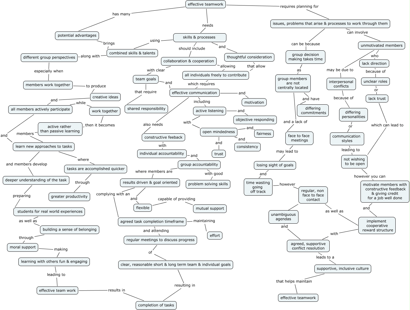 This Concept Map, created with IHMC CmapTools, has information related to: PSYC13020 draft 1, effective communication including active listening, creative ideas and all members actively participate, regular, non face to face contact as well as implement cooperative reward structure, active listening and objective responding, individual accountability and group accountability, thoughtful consideration that allow all individuals freely to contribute, open mindedness and trust, interpersonal conflicts because of differing personalities, group accountability where members are results driven & goal oriented, effective team work results in completion of tasks, open mindedness and fairness, effective teamwork has many potential advantages, group members are not centrally located and a lack of face to face meetings, unambiguous agendas and agreed, supportive conflict resolution, clear, reasonable short & long term team & individual goals resulting in completion of tasks, potential advantages brings combined skills & talents, results driven & goal oriented complying with an agreed task completion timeframe, unmotivated members may be due to interpersonal conflicts, skills & processes and thoughtful consideration, skills & processes using combined skills & talents