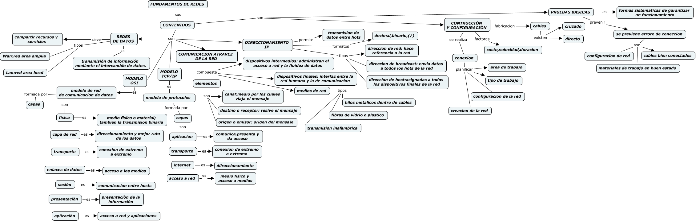 Este Cmap, tiene información relacionada con: fundamento de redes1.cmap, REDES DE DATOS sirve compartir recursos y servicios, CONTENIDOS son MODELO TCP/IP, conexion planificar tipo de trabajo, aplicacion es comunica,presenta y da acceso, COMUNICACION ATRAVEZ DE LA RED compuesta dispositivos finales: interfaz entre la red humana y la de comunicacion, MODELO OSI es modelo de red de comunicacion de datos, COMUNICACION ATRAVEZ DE LA RED compuesta medios de red, capas son internet, COMUNICACION ATRAVEZ DE LA RED compuesta dispositivos intermedios: administran el acceso a red y la fluidez de datos, capas son enlaces de datos, transporte es conexion de extremo a extremo, DIRECCIONAMIENTO IP tipos direccion de red: hace referencia a la red, REDES DE DATOS tipos Wan:red area amplia, CONTENIDOS son PRUEBAS BASICAS, medios de red tipos fibras de vidrio o plastico, CONTENIDOS son COMUNICACION ATRAVEZ DE LA RED, FUNDAMENTOS DE REDES sus CONTENIDOS, conexion planificar creacion de la red, fisica es medio fisico o material; tambien la transmision binaria, elementos son origen o emisor: origen del mensaje