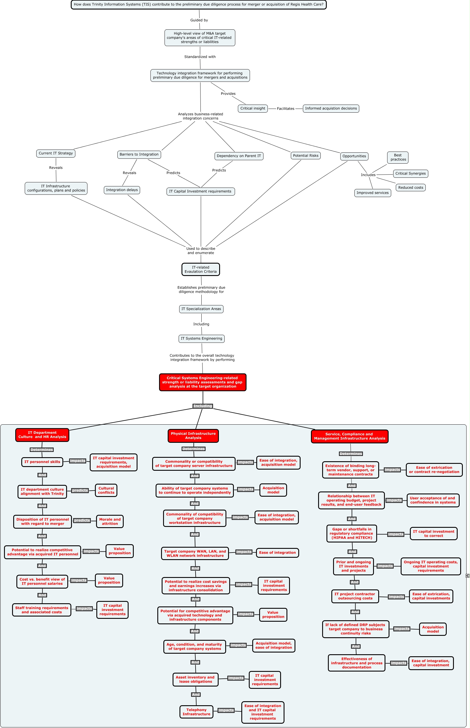 This Concept Map, created with IHMC CmapTools, has information related to: Josh_Individual_7-21, IT Systems Engineering Contributes to the overall technology integration framework by performing Critical Systems Engineering-related strength or liability assessments and gap analysis at the target organization, IT project contractor outsourcing costs impacts Ease of extrication, capital investments, Gaps or shortfalls in regulatory compliance (HIPAA and HITECH) And Prior and ongoing IT investments and projects, Opportunities Includes Critical Synergies, Integration delays Used to describe and enumerate IT-related Evaulation Criteria, Ability of target company systems to continue to operate independently impacts Acquisition model, Asset inventory and lease obligations And Telephony Infrastructure, Potential for competitive advantage via acquired technology and infrastructure components impacts Value proposition, Barriers to Integration Reveals Integration delays, Asset inventory and lease obligations impacts IT capital investment requirements, Critical Systems Engineering-related strength or liability assessments and gap analysis at the target organization Including IT Department Culture and HR Analysis, IT department culture alignment with Trinity And Disposition of IT personnel with regard to merger, Technology integration framework for performing preliminary due diligence for mergers and acquisitions Analyzes business-related integration concerns Barriers to Integration, Dependency on Parent IT Predicts IT Capital Investment requirements, Age, condition, and maturity of target company systems And Asset inventory and lease obligations, Staff training requirements and associated costs impacts IT capital investment requirements, Prior and ongoing IT investments and projects impacts Ongoing IT operating costs, capital investment requirements, Disposition of IT personnel with regard to merger predicts Morale and attrition, Commonality of compatibility of target company workstation infrastructure impacts Ease of integration, acquisition model, Potential to realize cost savings and earnings increases via infrastructure consolidation And Potential for competitive advantage via acquired technology and infrastructure components
