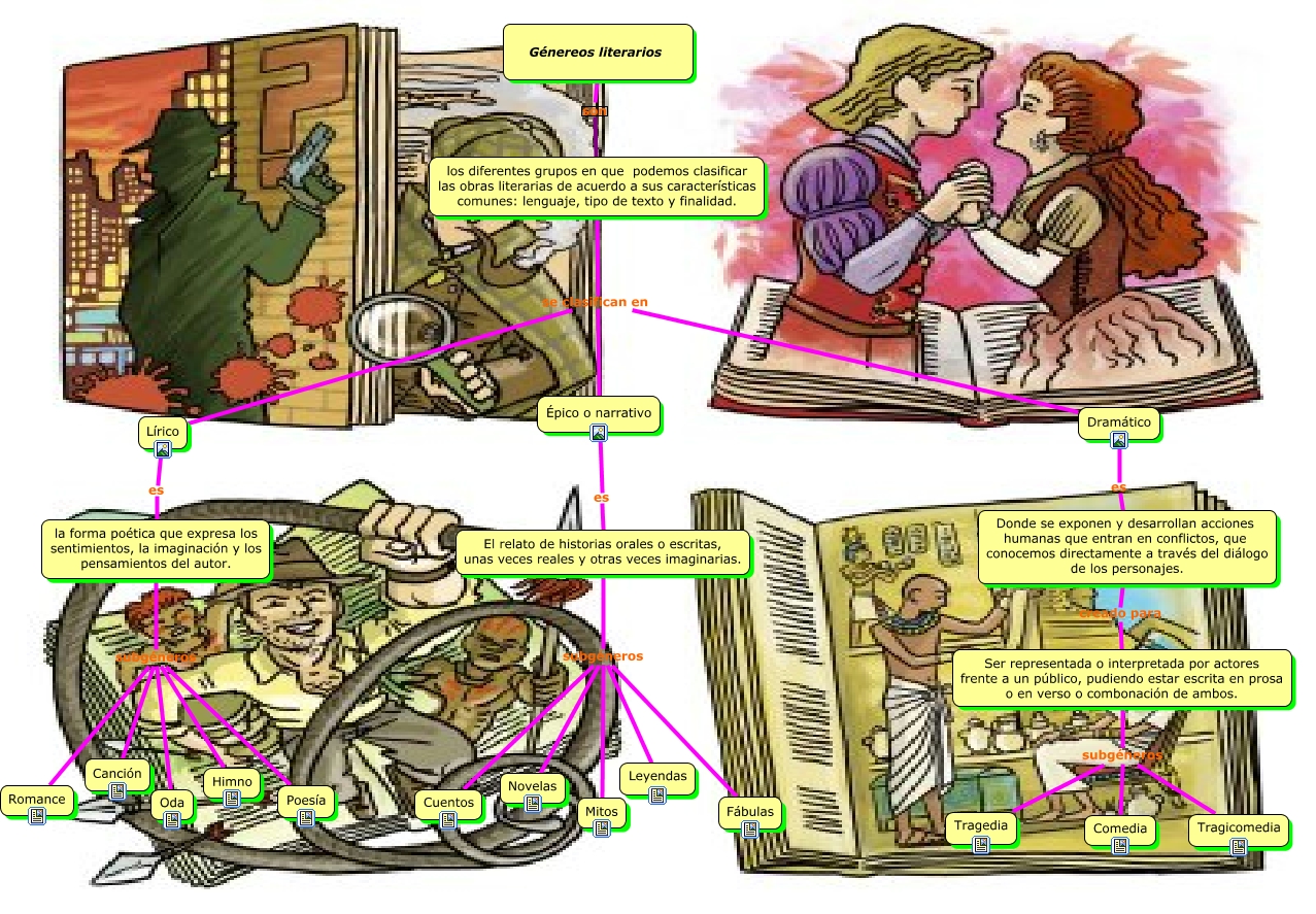 Este Cmap, tiene información relacionada con: Géneros literarios, Ser representada o interpretada por actores frente a un público, pudiendo estar escrita en prosa o en verso o combonación de ambos. subgéneros Tragedia, los diferentes grupos en que podemos clasificar las obras literarias de acuerdo a sus características comunes: lenguaje, tipo de texto y finalidad. se clasifican en Dramático, El relato de historias orales o escritas, unas veces reales y otras veces imaginarias. subgéneros Fábulas, El relato de historias orales o escritas, unas veces reales y otras veces imaginarias. subgéneros Novelas, Lírico es la forma poética que expresa los sentimientos, la imaginación y los pensamientos del autor., El relato de historias orales o escritas, unas veces reales y otras veces imaginarias. subgéneros Cuentos, Épico o narrativo es El relato de historias orales o escritas, unas veces reales y otras veces imaginarias., la forma poética que expresa los sentimientos, la imaginación y los pensamientos del autor. subgéneros Himno, Ser representada o interpretada por actores frente a un público, pudiendo estar escrita en prosa o en verso o combonación de ambos. subgéneros Comedia, la forma poética que expresa los sentimientos, la imaginación y los pensamientos del autor. subgéneros Poesía, la forma poética que expresa los sentimientos, la imaginación y los pensamientos del autor. subgéneros Romance, Donde se exponen y desarrollan acciones humanas que entran en conflictos, que conocemos directamente a través del diálogo de los personajes. creado para Ser representada o interpretada por actores frente a un público, pudiendo estar escrita en prosa o en verso o combonación de ambos., Ser representada o interpretada por actores frente a un público, pudiendo estar escrita en prosa o en verso o combonación de ambos. subgéneros Tragicomedia, El relato de historias orales o escritas, unas veces reales y otras veces imaginarias. subgéneros Mitos, Génereos literarios son los diferentes grupos en que podemos clasificar las obras literarias de acuerdo a sus características comunes: lenguaje, tipo de texto y finalidad., El relato de historias orales o escritas, unas veces reales y otras veces imaginarias. subgéneros Leyendas, la forma poética que expresa los sentimientos, la imaginación y los pensamientos del autor. subgéneros Oda, los diferentes grupos en que podemos clasificar las obras literarias de acuerdo a sus características comunes: lenguaje, tipo de texto y finalidad. se clasifican en Épico o narrativo, la forma poética que expresa los sentimientos, la imaginación y los pensamientos del autor. subgéneros Canción, Dramático es Donde se exponen y desarrollan acciones humanas que entran en conflictos, que conocemos directamente a través del diálogo de los personajes.