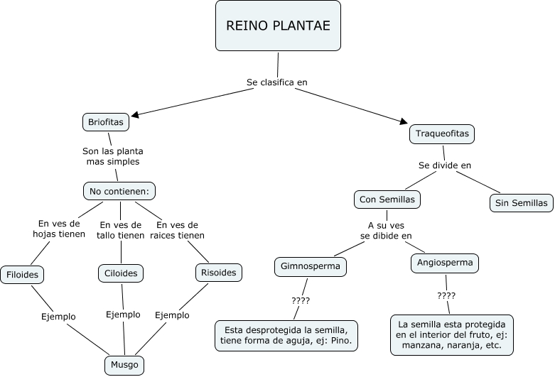 Este Cmap, tiene información relacionada con: ANA PAULA F, REINO PLANTAE Se clasifica en Traqueofitas, Traqueofitas Se divide en Con Semillas, No contienen: En ves de tallo tienen Ciloides, Con Semillas A su ves se dibide en Gimnosperma, No contienen: En ves de hojas tienen Filoides, Gimnosperma ???? Esta desprotegida la semilla, tiene forma de aguja, ej: Pino., Risoides Ejemplo Musgo, REINO PLANTAE Se clasifica en Briofitas, Filoides Ejemplo Musgo, No contienen: En ves de raices tienen Risoides, Traqueofitas Se divide en Sin Semillas, Ciloides Ejemplo Musgo, Angiosperma ???? La semilla esta protegida en el interior del fruto, ej: manzana, naranja, etc., Con Semillas A su ves se dibide en Angiosperma, Briofitas Son las planta mas simples No contienen: