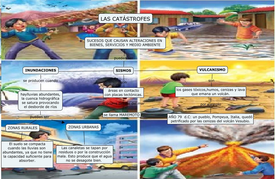 Este Cmap, tiene información relacionada con: TRABAJO, SISMOS son áreas en contacto con placas tectónicas., SISMOS ???? VULCANISMO, ZONAS URBANAS ???? Las canaletas se tapan por residuos o por la construcción mala. Esto produce que el agua no se desagote bien., los gases tóxicos,humos, cenizas y lava que emana un volcán. por ejemplo AÑO 79 d.C: un pueblo, Pompeya, Italia, quedó petrificado por las cenizas del volcán Vesubio., haylluvias abundantes, la cuenca hidrográfica se satura provocando el desborde de ríos pueden ser ZONAS URBANAS, haylluvias abundantes, la cuenca hidrográfica se satura provocando el desborde de ríos pueden ser ZONAS RURALES, LAS CATÁSTROFES son SUCESOS QUE CAUSAN ALTERACIONES EN BIENES, SERVICIOS Y MEDIO AMBIENTE, SISMOS ???? INUNDACIONES, VULCANISMO son los gases tóxicos,humos, cenizas y lava que emana un volcán., áreas en contacto con placas tectónicas. si ocurre debajo del mar se llama MAREMOTO, ZONAS RURALES ???? El suelo se compacta cuando las lluvias son abundantes, ya que no tiene la capacidad suficiente para absorber., SUCESOS QUE CAUSAN ALTERACIONES EN BIENES, SERVICIOS Y MEDIO AMBIENTE pueden ser SISMOS, INUNDACIONES se producen cuando haylluvias abundantes, la cuenca hidrográfica se satura provocando el desborde de ríos