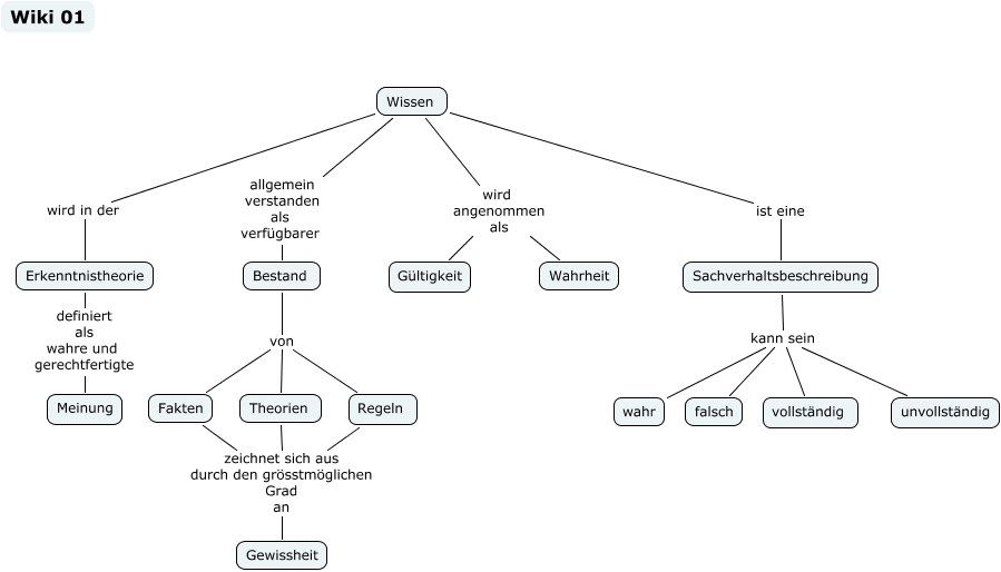 Dieses mit IHMC CmapTools erstellte CMap hat Informationen bezüglich: Wiki 01, Sachverhaltsbeschreibung kann sein unvollständig, Theorien zeichnet sich aus durch den grösstmöglichen Grad an Gewissheit, Wissen ist eine Sachverhaltsbeschreibung, Fakten zeichnet sich aus durch den grösstmöglichen Grad an Gewissheit, Wissen wird angenommen als Wahrheit, Sachverhaltsbeschreibung kann sein vollständig, Bestand von Theorien, Erkenntnistheorie definiert als wahre und gerechtfertigte Meinung, Bestand von Fakten, Regeln zeichnet sich aus durch den grösstmöglichen Grad an Gewissheit, Wissen allgemein verstanden als verfügbarer Bestand, Sachverhaltsbeschreibung kann sein wahr, Bestand von Regeln, Sachverhaltsbeschreibung kann sein falsch, Wissen wird in der Erkenntnistheorie, Wissen wird angenommen als Gültigkeit