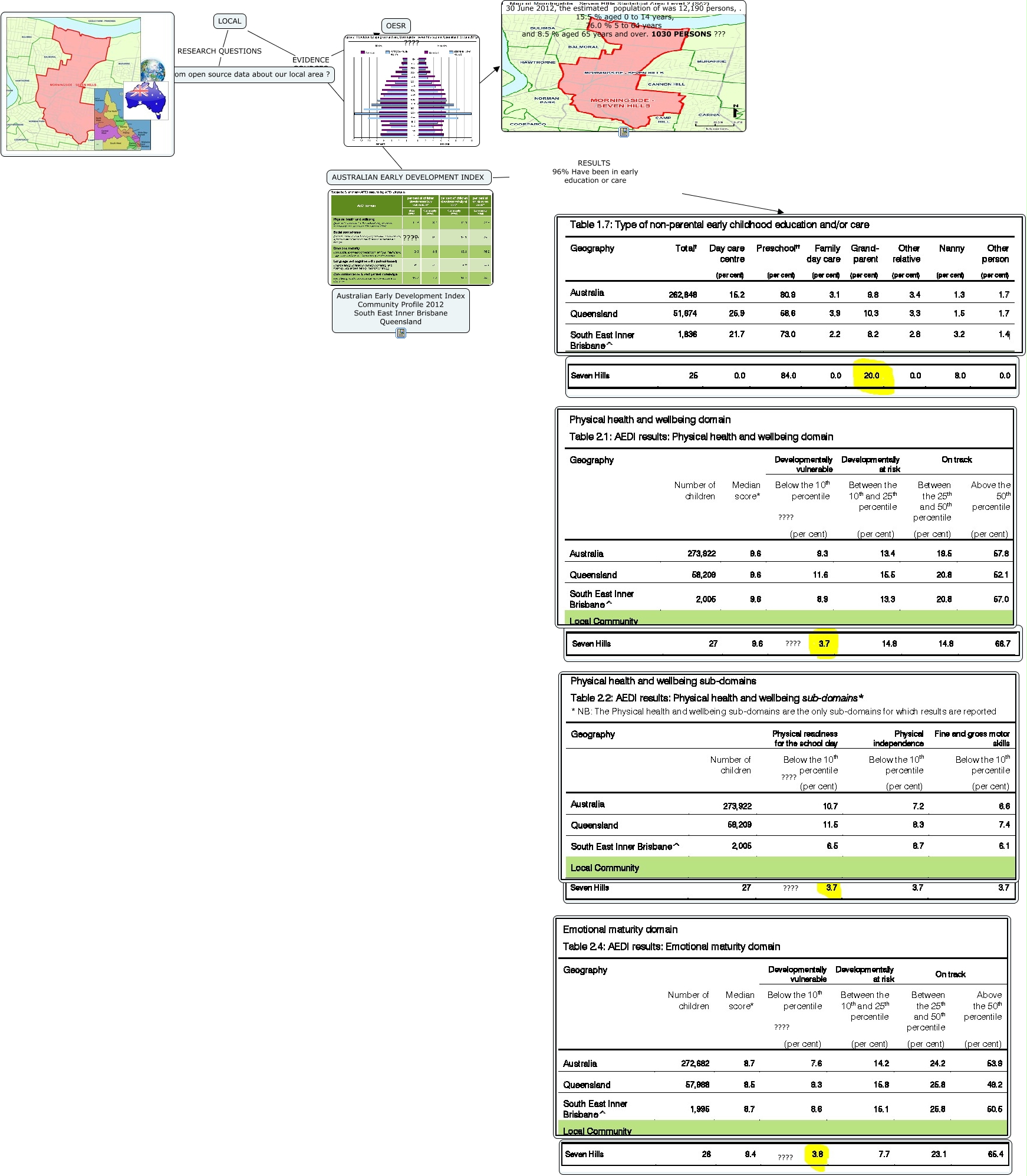 This Concept Map, created with IHMC CmapTools, has information related to: local,state national global pressures on schools, LOCAL RESEARCH QUESTIONS What can we find from open source data about our local area ?, OESR RESULTS 30 June 2012, the estimated population of was 12,190 persons, . 15.5 % aged 0 to 14 years, 76.0 % 5 to 64 years and 8.5 % aged 65 years and over. 1030 PERSONS ???, LOCAL EVIDENCE SOURCES OESR, LOCAL EVIDENCE SOURCES AUSTRALIAN EARLY DEVELOPMENT INDEX, AUSTRALIAN EARLY DEVELOPMENT INDEX RESULTS 96% Have been in early education or care