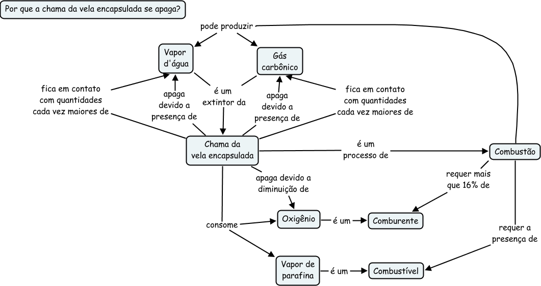 This Concept Map, created with IHMC CmapTools, has information related to: Chama da vela 1, Combustão requer mais que 16% de Comburente, Gás carbônico é um extintor da Chama da vela encapsulada, Chama da vela encapsulada consome Vapor de parafina, Chama da vela encapsulada consome Oxigênio, Vapor de parafina é um Combustível, Chama da vela encapsulada apaga devido a diminuição de Oxigênio, Chama da vela encapsulada é um processo de Combustão, Combustão requer a presença de Combustível, Chama da vela encapsulada fica em contato com quantidades cada vez maiores de Vapor d'água, Chama da vela encapsulada fica em contato com quantidades cada vez maiores de Gás carbônico, Vapor d'água é um extintor da Chama da vela encapsulada, Chama da vela encapsulada apaga devido a presença de Vapor d'água, Oxigênio é um Comburente, Combustão pode produzir Gás carbônico, Combustão pode produzir Vapor d'água, Chama da vela encapsulada apaga devido a presença de Gás carbônico