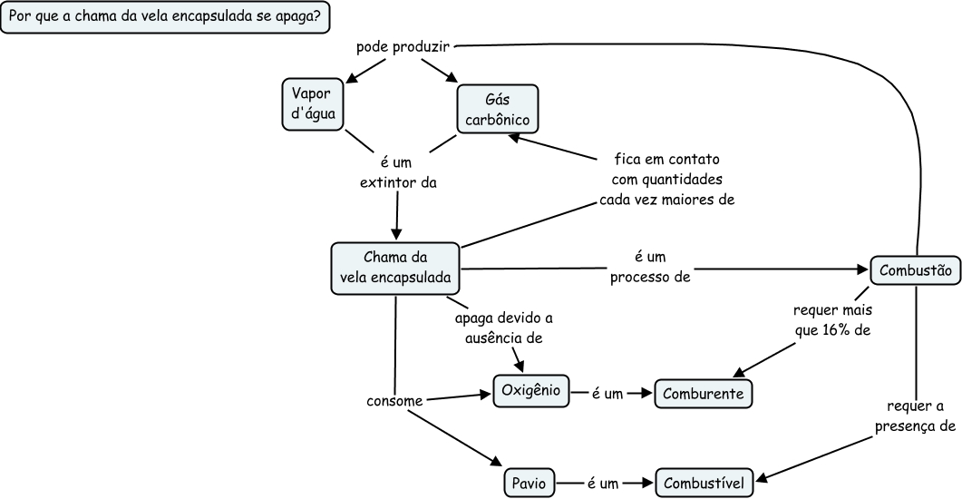 This Concept Map, created with IHMC CmapTools, has information related to: Chama da vela 0, Combustão pode produzir Vapor d'água, Chama da vela encapsulada é um processo de Combustão, Chama da vela encapsulada consome Oxigênio, Chama da vela encapsulada apaga devido a ausência de Oxigênio, Chama da vela encapsulada fica em contato com quantidades cada vez maiores de Gás carbônico, Chama da vela encapsulada consome Pavio, Gás carbônico é um extintor da Chama da vela encapsulada, Combustão requer mais que 16% de Comburente, Oxigênio é um Comburente, Combustão requer a presença de Combustível, Combustão pode produzir Gás carbônico, Vapor d'água é um extintor da Chama da vela encapsulada, Pavio é um Combustível